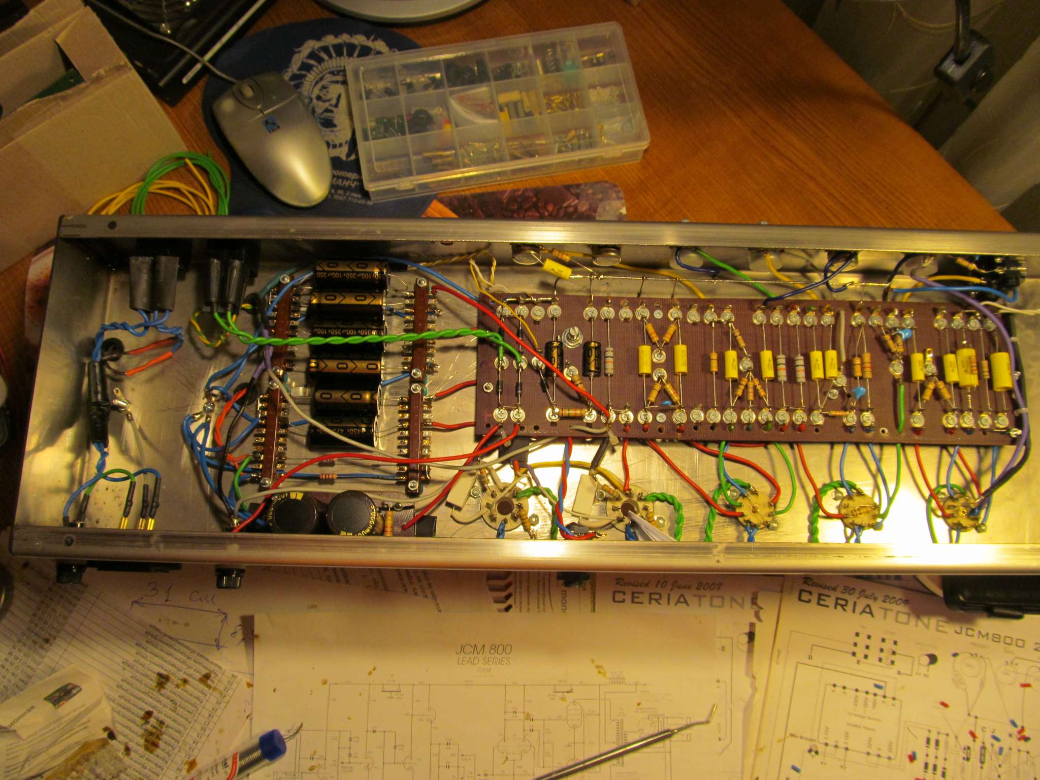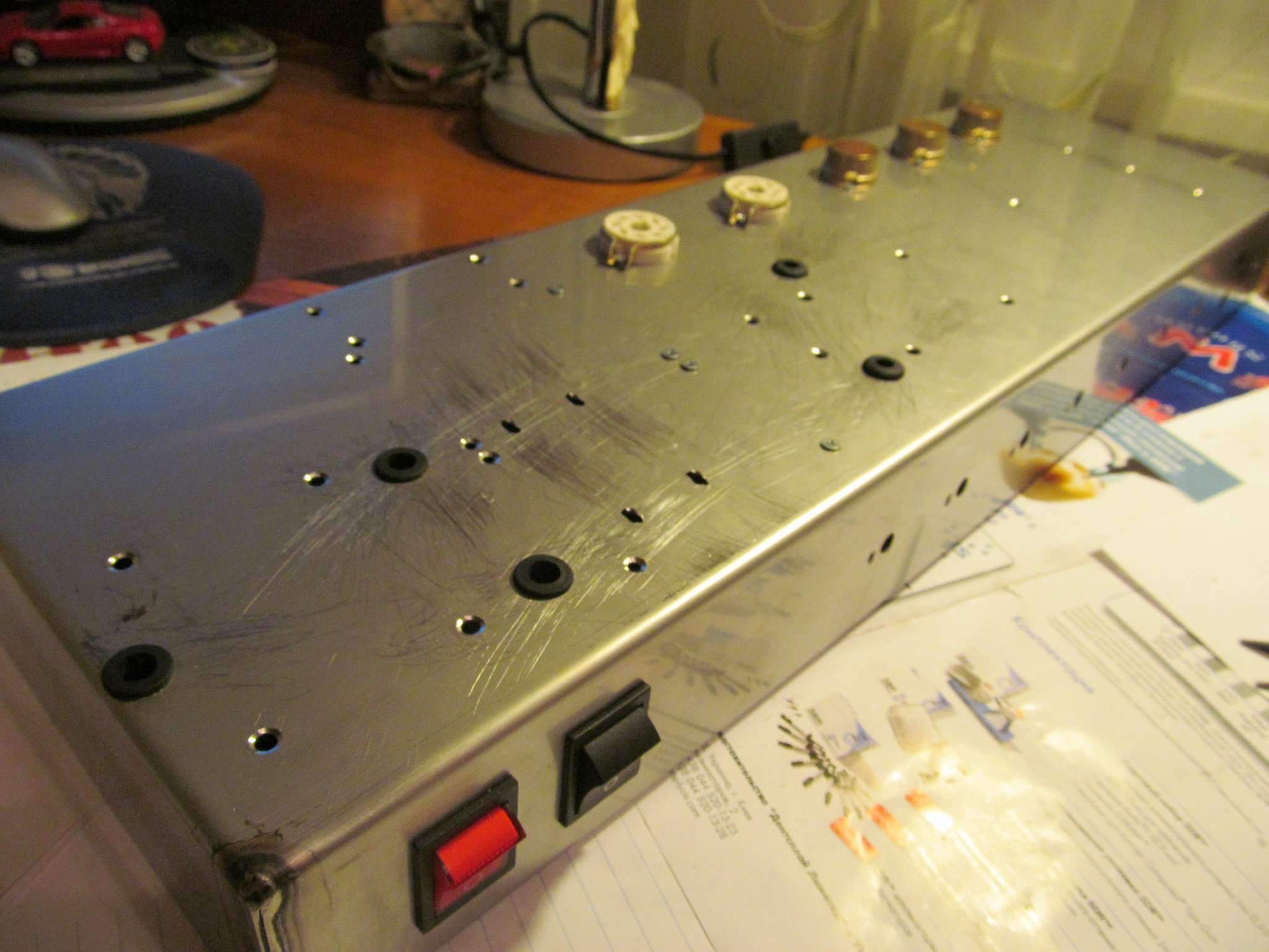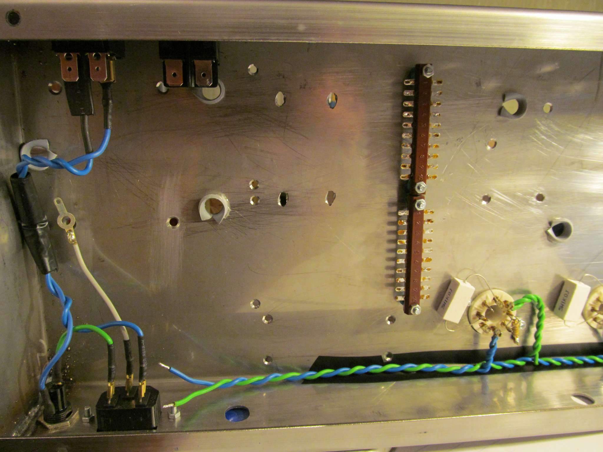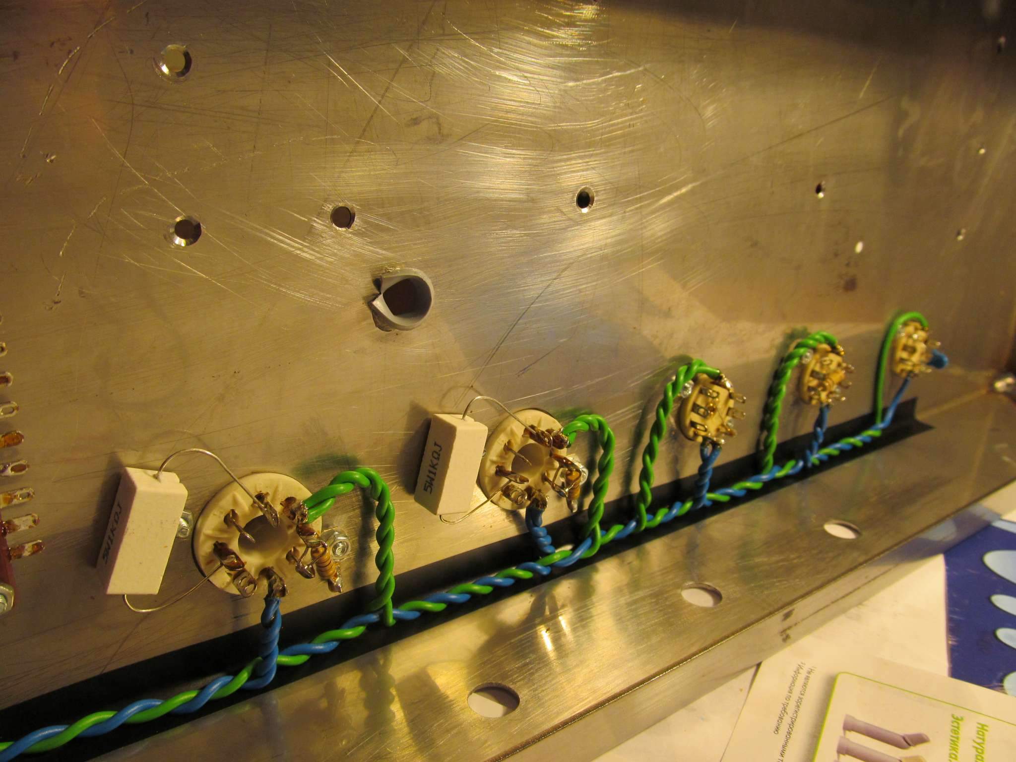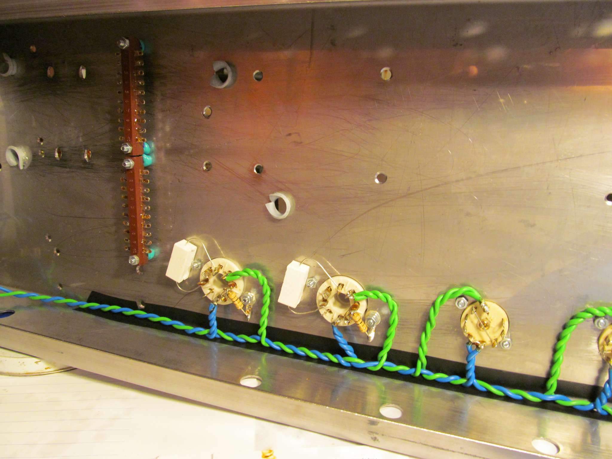 Начал распаивать внутри шасси. Пока развожу силовые цепи- накал и питание. Шасси заказал из нержавейки 1,5 мм , сделали очень хорошо и качественно погнули, и вырезали большие отверстия . Все маленькие отверстия пришлось досверливать самому , по ходу расстановки компонентов . Сверлить нержавейку- ещё то удовольствие, почти неделю потратил на это ))) . Сверлил на самых маленьких оборотах, и с отводом тепла от сверла касторовым маслом. Намучился, но оно того стоит , внешний вид шасси из нержавейки лучше чем из обычной стали.