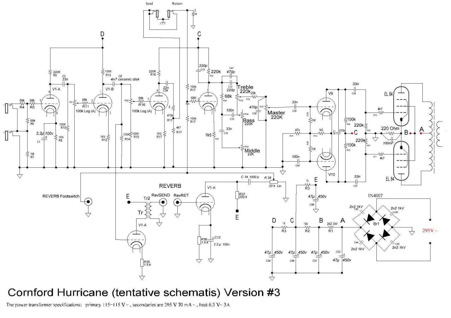 http://forum.musicradar.com/showthread.php?126063-Amp-transformer-move Исходя из этих фото, а точней расположения проводов ведущих к Send/Return можно сделать вывод что разрыв у Харикейна находится после третьего каскада ( это же и обьясняет наличие резистора 4к7 об землю в районе третьего каскада что очень необычно, подобное есть только в каррере, там 15 к об землю перед Send) а темброблок расположен после 4-го каскада и сразу же переходит в "фазик" через межкаскадник 33н. Посему я исправил свою схему, которую и предлагаю вашему вниманию