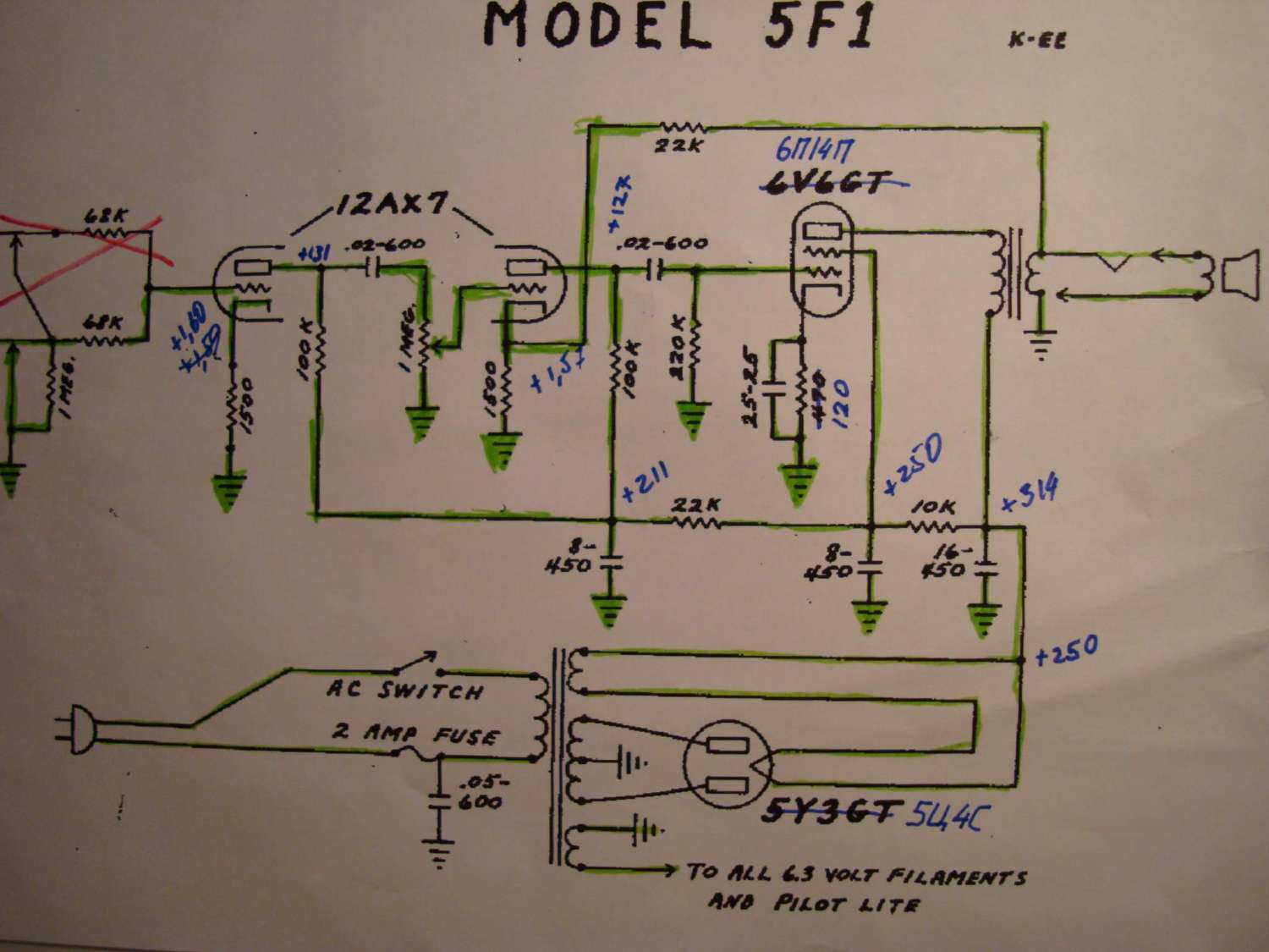 : заменил кондеры, подклеил цоколь кенотрона, поменял панельки, перепаял питание триода под 12AX7. Все собрал, включаюсь сначала только с кенотроном, потом только с 12AX7 - полет нормальный. Вставляю 6П14П, прогрев, появляется гул. Меряю напряжение на катоде, оно у меня получается равным 6,1 В. Я так понимаю, что этого чудовищно мало, отсюда грузится выходной каскад