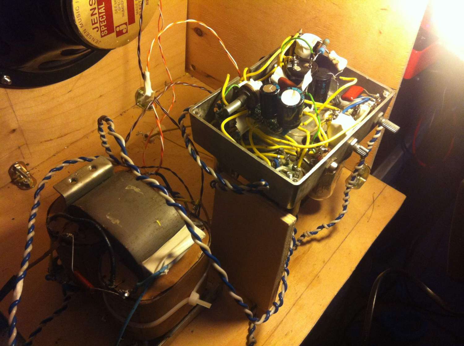... и добавил:отключи обратную связь - убери провод что идет от выходного гнезда до 22к. второй конец вторичной обмотки (с толстыми проводами) выходного трансформатора заземлен?