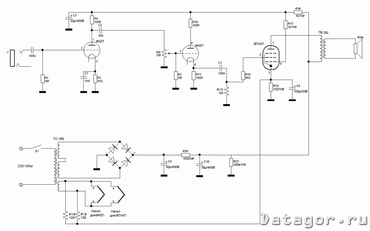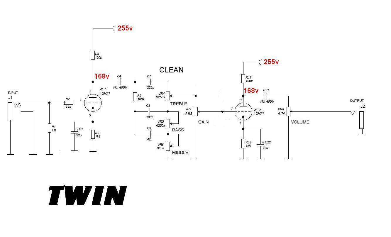Прошу прощения, может не совсем по теме, но не хотелось создавать новую. Собрал я, скажем так, макет некоего усилителя по приведенной ниже схеме. Несмотря на очень своеобразный монтаж и использованные детали, ничего не шумит, звук чистый и достаточно громкий. Решил продолжить эксперименты. Заказал корпус, сейчас выбираю трансформаторы. Однако, появилось желание немного усложнить схему и применить чистый канал из Твина. Вопрос следующий, могу ли я безболезненно добавить к схеме Твина оконечник на 6п14п из первой схемы и нужно ли будет менять номиналы обвеса. Спасибо