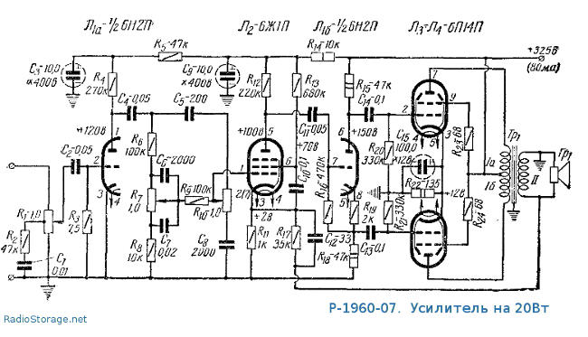 1 Во первых у меня динамик мощный для это усилителя. Я меняю схему выходного каскада на ту что была в старом журнале Моделист конструктор из 2 ламп 6П14 было заявлено мощность 20 Вт.