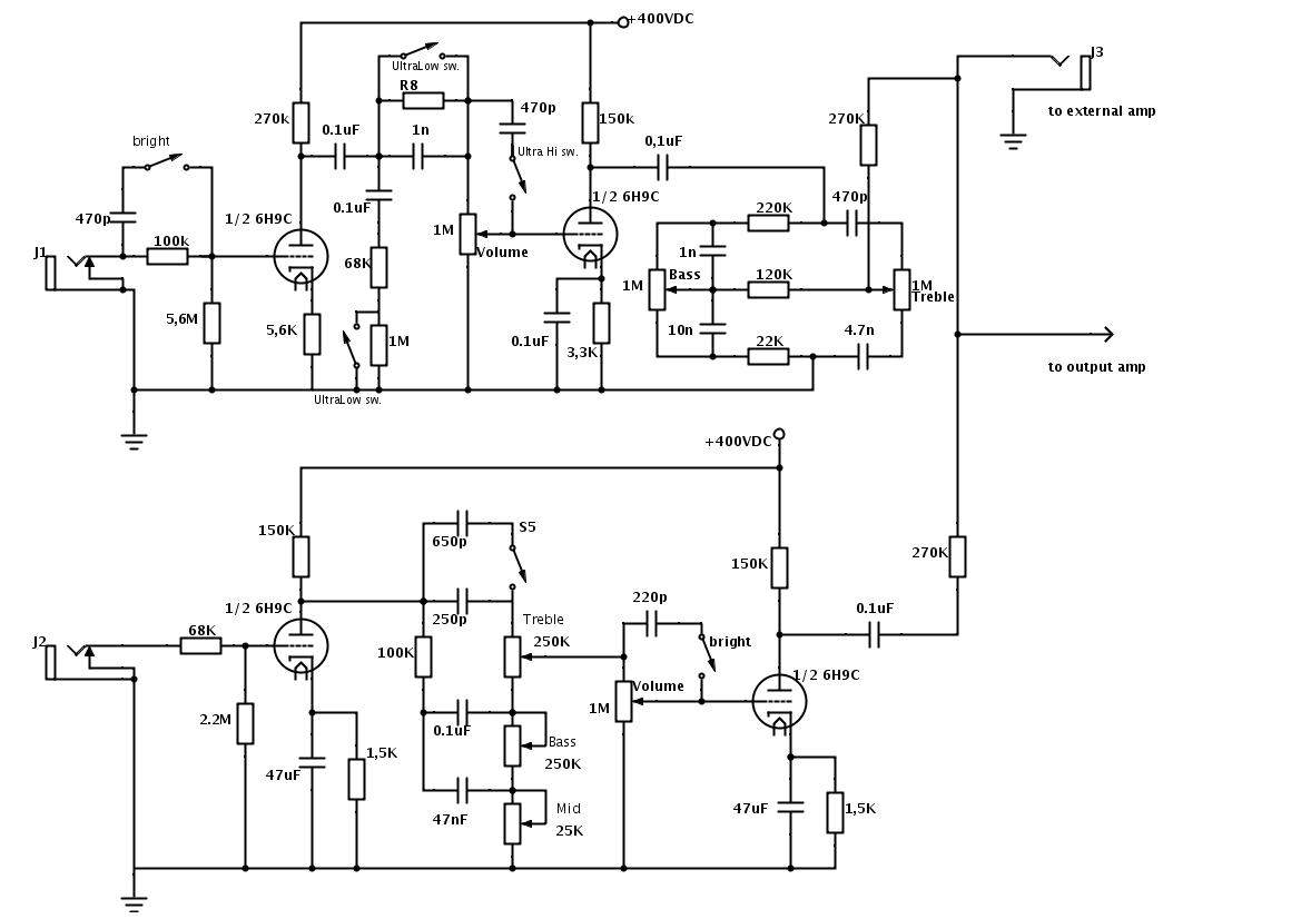 Благодаря одному другу я стал обладателем большого кол-ва интересных ламп. Среди которых несколько штук замечательных 6Н9С и 6П3С. Возникло желание сделать небольшую голову, для занятий дома, и для небольших тихих концертов. Но дело в том - что у меня есть пара инструментов, которые я использую в зависимости от мероприятия - либо винтажный джазбас и прессижн, либо более модерновая по звуку ямаха. Ямаха отлично звучит во всевозможные ампеги, а вот фендер больше любит что-то более винтажное (или я люблю? хз). - т.е. бассман и тому подобное. Поэтому возникла мысль - а почему бы не сделать двухканальную голову? время есть, лампы-панельки-детали тоже. Вопрос в двух трансах - питание и выходник, ну и корпус и прочее. Задумка интересная, тем более что есть доступный каб на 2*10ки с отличными динамиками.