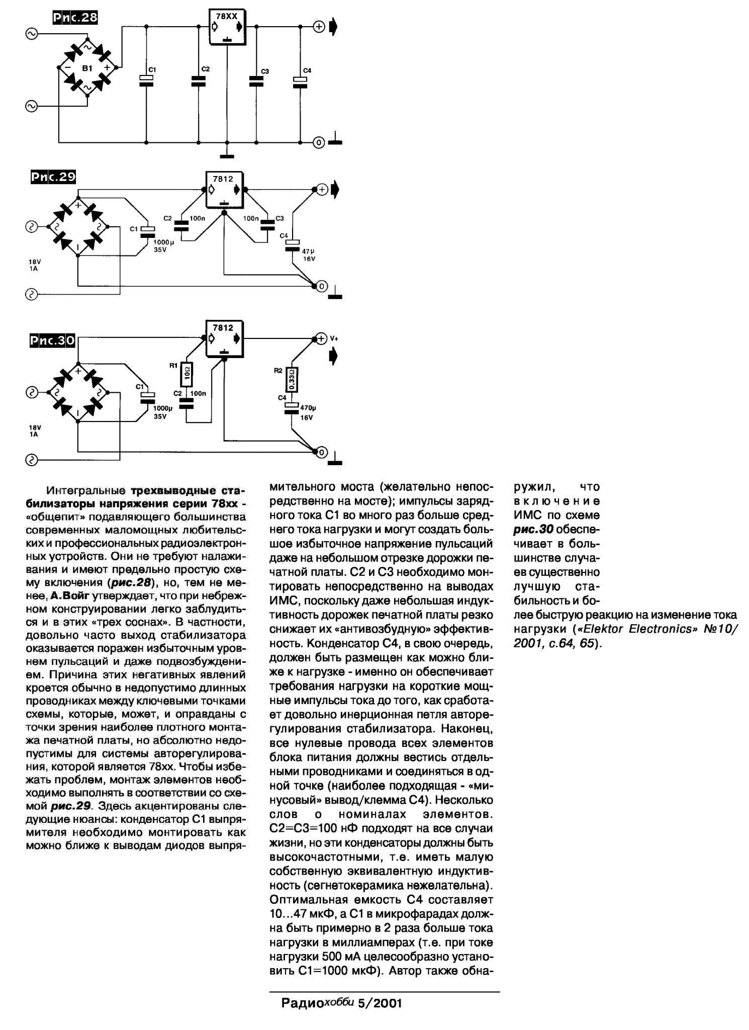 Кстати, если вы сами делаете педали, то лучше их делать нормально, чем городить ...надцатиканальный БП. Например, делать, как Лев - он ставит транзисторный фильтр, который давит помехи по шине питания на несколько десятков дБ. Это правильно, потом точно никто не скажет, что, мол, "от БП фонит, а от Кроны звук лучше". Я тоже так делаю, только на одном транзисторе. Цена такого усовершенствования - копейки. Схема подобного фильтра для примера взята из Босс вау. Чем больше потребление, тем меньше должен быть R27. Для 10-13 мА дисторшна я ставлю 6,8 кОм. С18 лучше больше, я ставлю 100/16. На линию +8 ставлю 10 мкФ (больше не надо, не имеет смысла!) и, если надо, керамику 0,1...0,33 мкФ прямо возле ОУ.