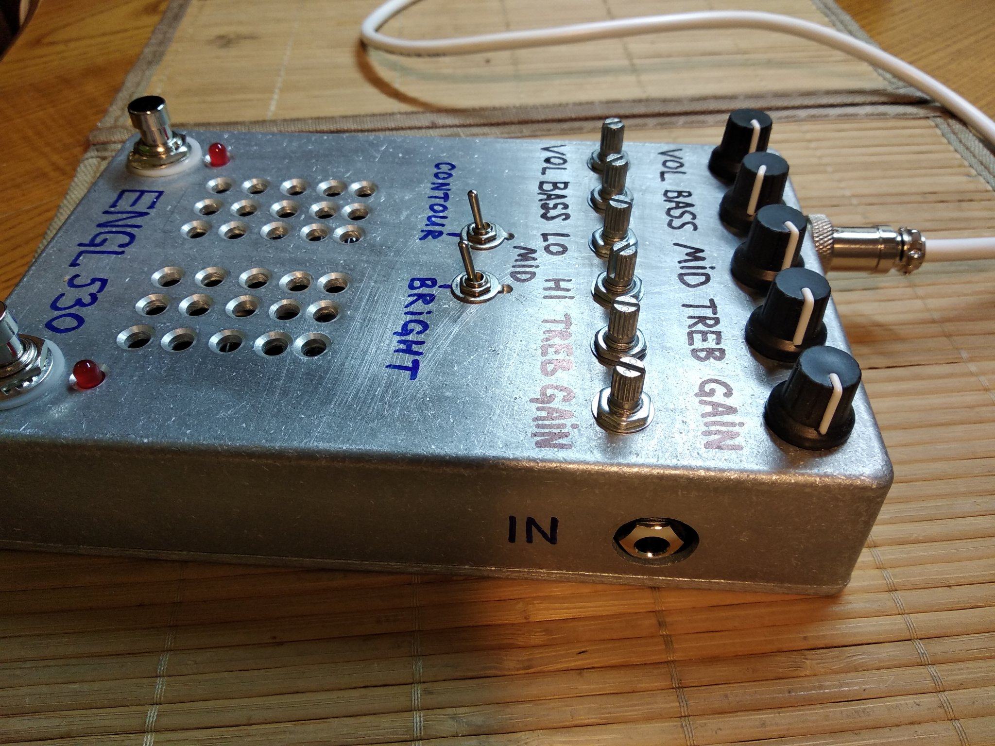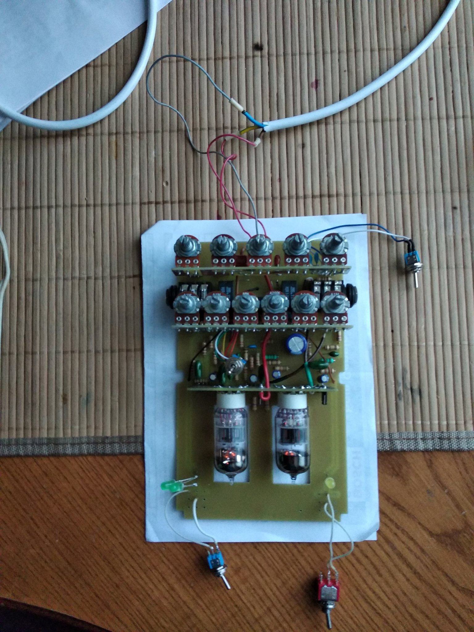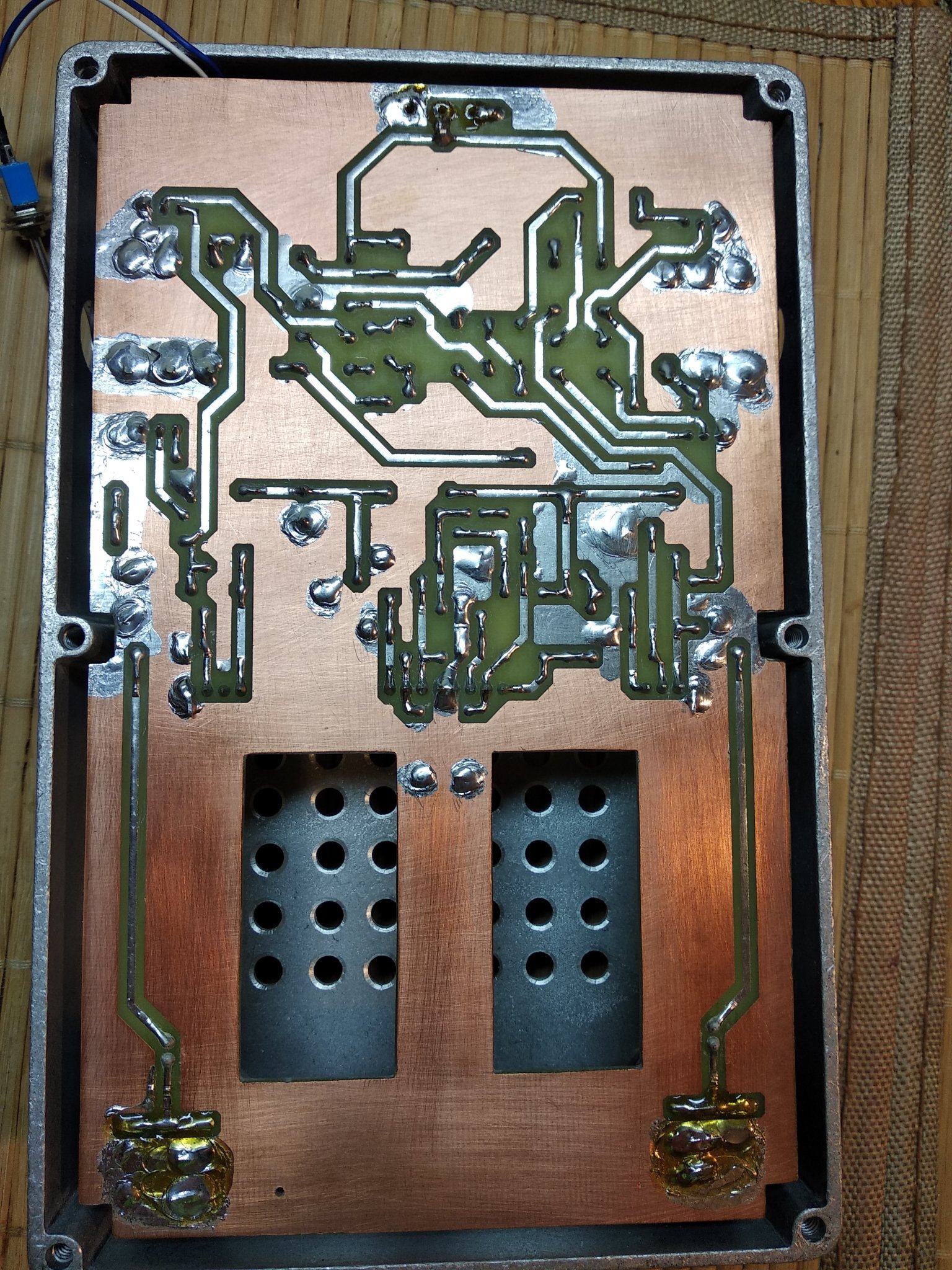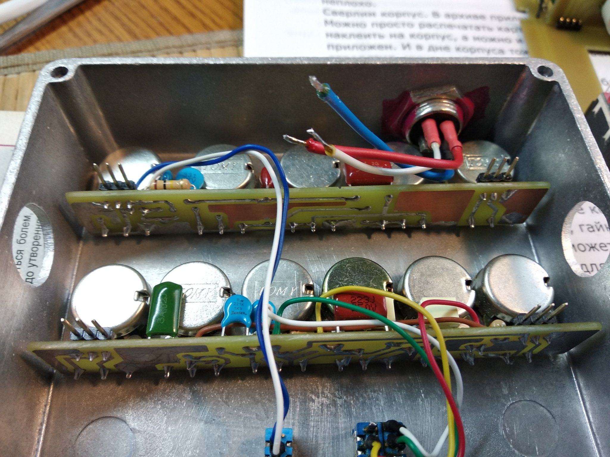 Все , допилил я наконец то свой напольник. Все работает, звучит. При сборке оказалось несколько моментов. Во первых сам корпус оказался немного больше платы, наверное автор делал печатку под гаинтовский корпус , а я нашел только китайское подобие Хаммонд 1590 DD . И через это гнезда под вход и выход не доставали до самих стенок , чтобы их можна было прикрутить к корпусу. Никаких претензий ни к кому нет , надо было сразу купить корпус .Выход из ситуации нашел. Придумал просто рассверлить отверстия побольше , чтобы закручивать гайки сразу насквозь , оказалось что так тоже держится отлично . В который раз убедился что надо сначала покупать корпус , а потом подгонять под него печатку . Ну вообщем и так тоже все отлично влезло. Других корпусов у нас нет в продаже. Кнопок 3PDT тоже не было , поэтому поставил SPDT, припаял к плате перемычками , тоже отлично все вышло. Ну и решил использовать гнездо для подачи питания на преамп , а не просто проводом . Гнездо с штекером покупал на Алишке, точно не помню как называется . С корпусом фон и возбуды полностью пропали . Единственное что не очень удобно - это нет переключения между хай гейном сразу на клин, читал что можна потом добавить один тумблер между кнопками каналов. Над внешним видом пока особо не парюсь , мне и так устраивает , может потом нарисую какую-то лицевуху.