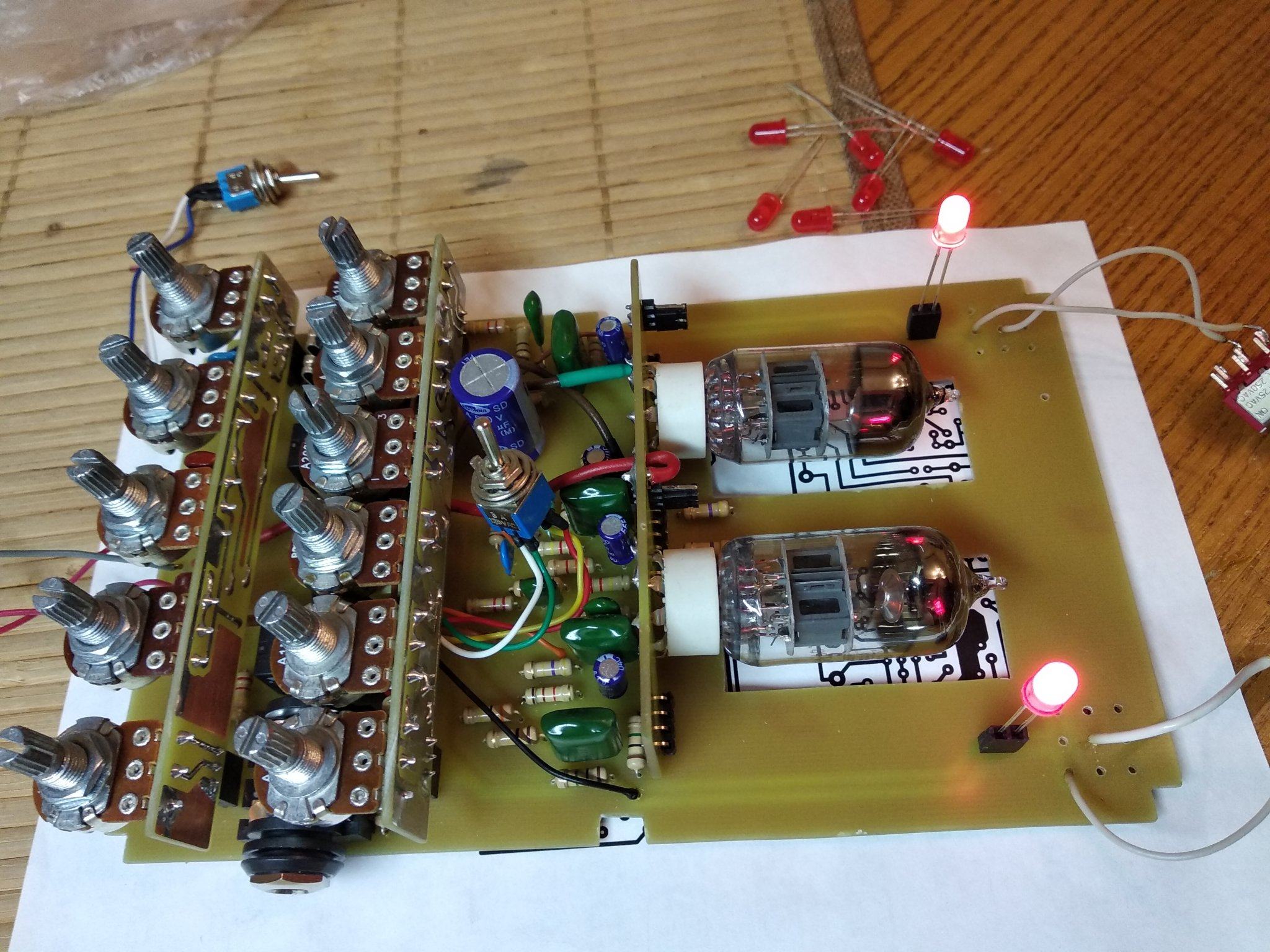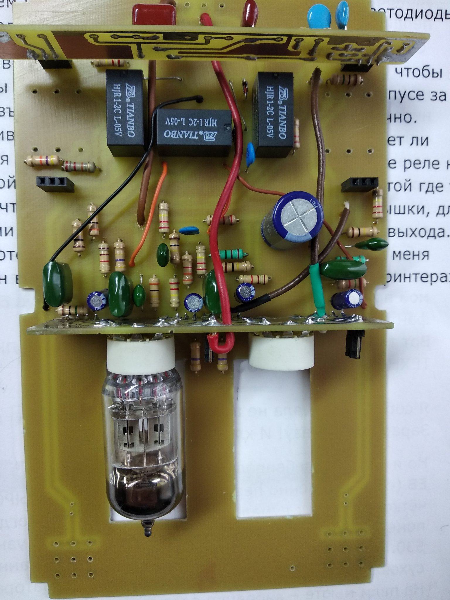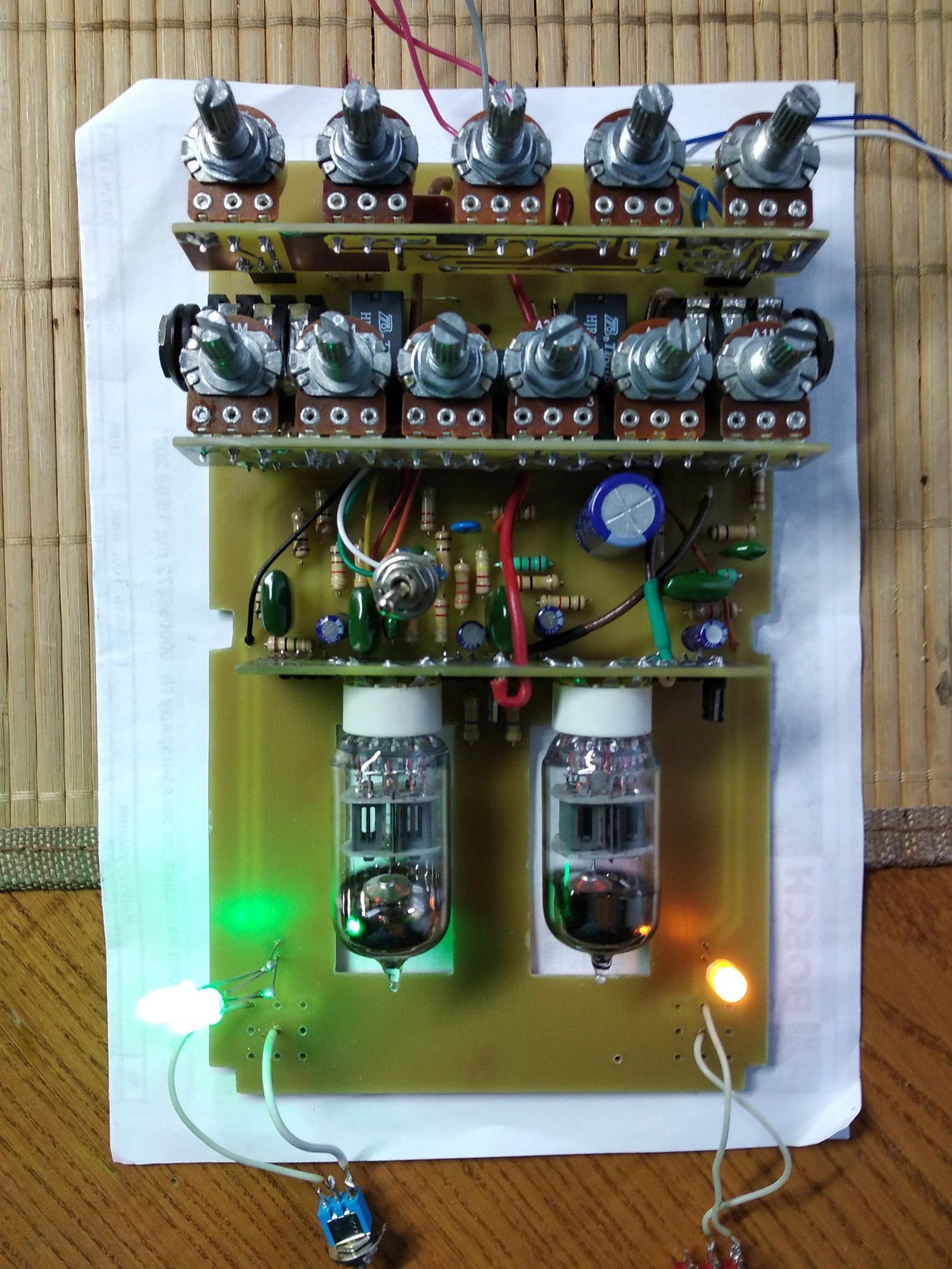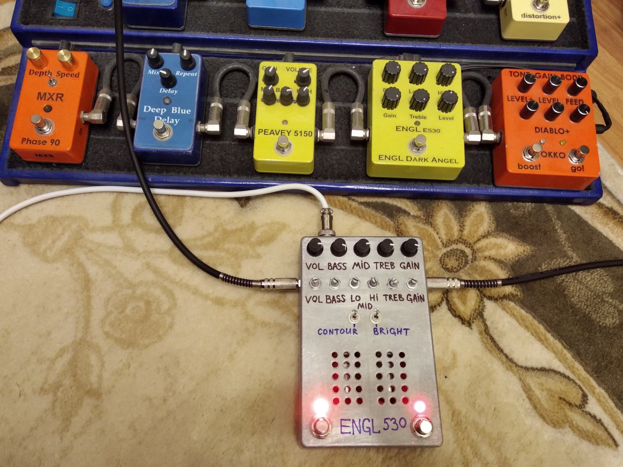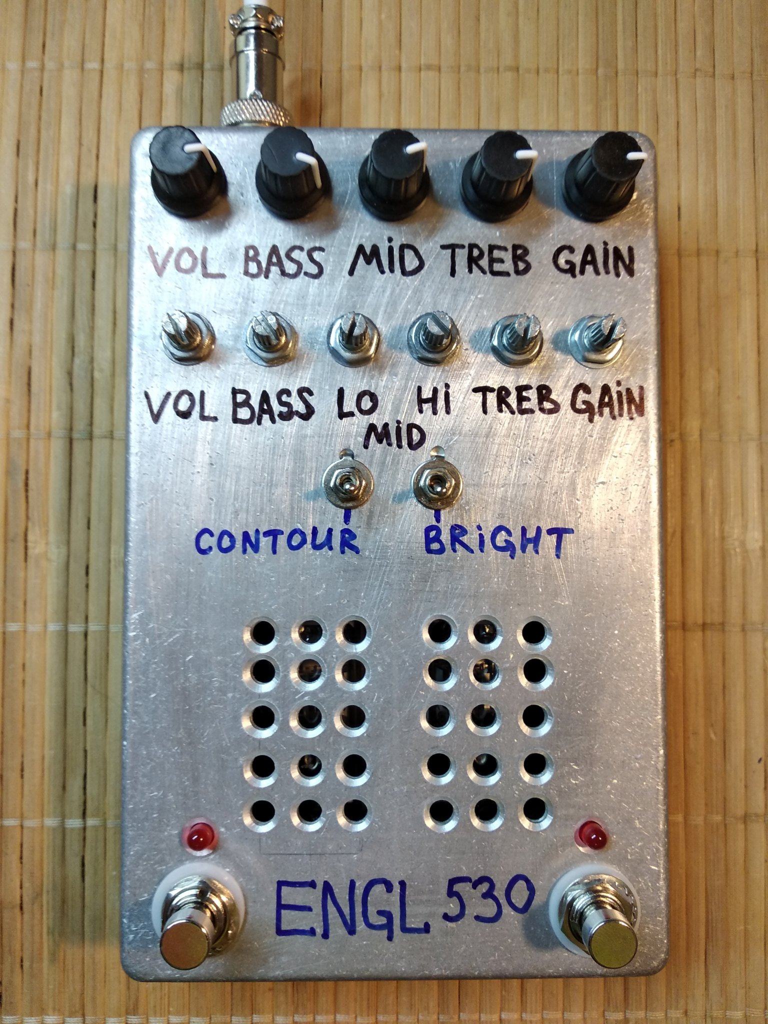 Все , допилил я наконец то свой напольник. Все работает, звучит. При сборке оказалось несколько моментов. Во первых сам корпус оказался немного больше платы, наверное автор делал печатку под гаинтовский корпус , а я нашел только китайское подобие Хаммонд 1590 DD . И через это гнезда под вход и выход не доставали до самих стенок , чтобы их можна было прикрутить к корпусу. Никаких претензий ни к кому нет , надо было сразу купить корпус .Выход из ситуации нашел. Придумал просто рассверлить отверстия побольше , чтобы закручивать гайки сразу насквозь , оказалось что так тоже держится отлично . В который раз убедился что надо сначала покупать корпус , а потом подгонять под него печатку . Ну вообщем и так тоже все отлично влезло. Других корпусов у нас нет в продаже. Кнопок 3PDT тоже не было , поэтому поставил SPDT, припаял к плате перемычками , тоже отлично все вышло. Ну и решил использовать гнездо для подачи питания на преамп , а не просто проводом . Гнездо с штекером покупал на Алишке, точно не помню как называется . С корпусом фон и возбуды полностью пропали . Единственное что не очень удобно - это нет переключения между хай гейном сразу на клин, читал что можна потом добавить один тумблер между кнопками каналов. Над внешним видом пока особо не парюсь , мне и так устраивает , может потом нарисую какую-то лицевуху.