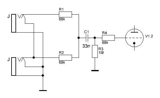 Странная какая то входная цепь, не вижу резистор об землю 1М на джеках. И такое ощущение что 33nF стоит последовательно с резистором, и красный провод это центральная жила экранированного кабеля, приходит в точку соединения 68к что идет в сетку лампы. Есть возможность снять термоусадку и посмотреть что и как? Пока мысли что это либо просто разделительный конденсатор по входу, либо радиофильтр об землю.