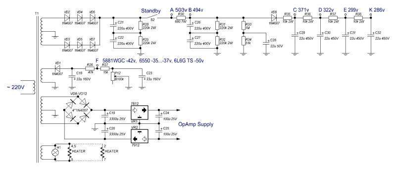 tiretrak, а блок питания на анодную нагрузку будешь разводить мостом? На схеме же полупериод. И, думаю, на готовой плате так же полупериодное выпрямление.