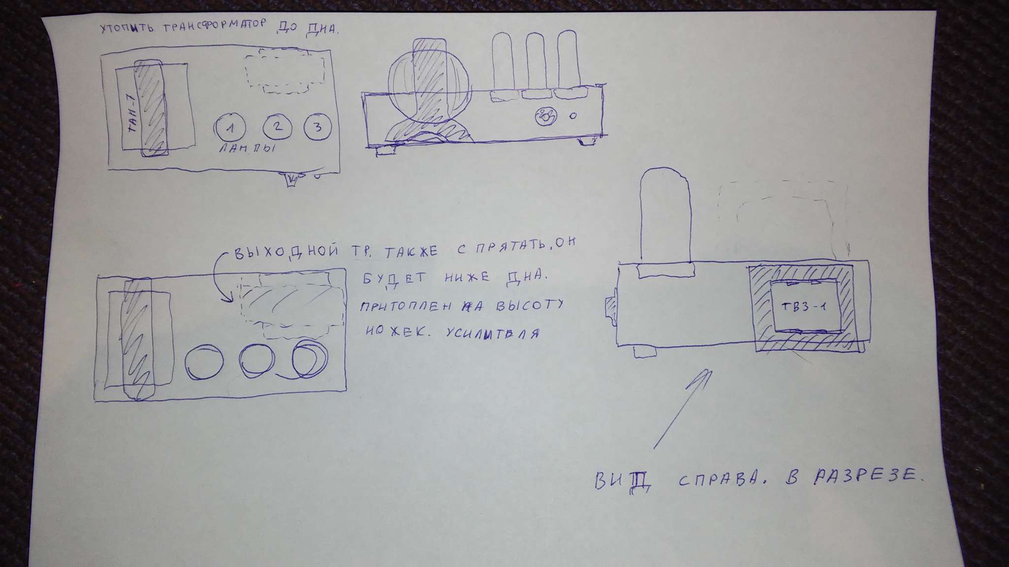 желательно шасси побольше взять, иначе внутри ты такую бороду проводов наделаешь, что не подступиться будет. Между лампами 2.5см, от транса до ламп от 5см(кенотрон можно и в упор влепить при необходимости).
