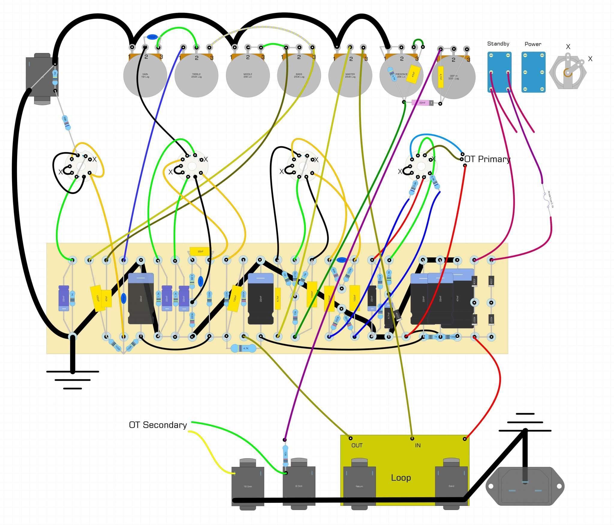 Аноды первого триода - тоже соеденены вместе. И идут на ту же точку, что и первый анод первой лампы. Петли в оригинальной схеме - нету.