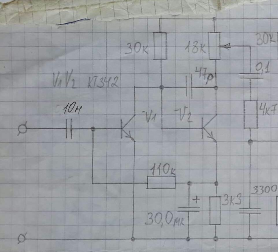 (добавить электролит шунтирующий "крону", 110к и 4,7к можно заменить на поты или подстроечники, транзисторы можно 3102 или какие нибудь более современные аналоги)