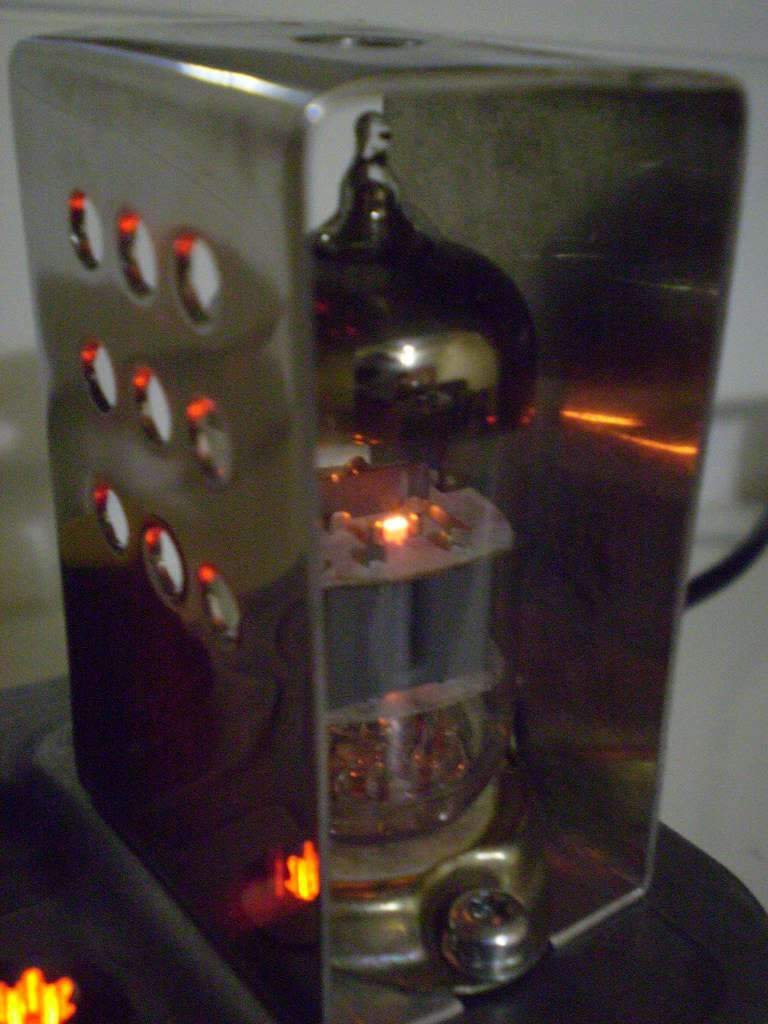 Когда-то баловался, делал ламповую педальку. Сделал такой защитный кожух. Полоска листового алюминия, толщиной чуть более миллиметра, выгнул в тисочках, насверлил отверстий, отполировал. Верхнее отверстие нужно для того, чтобы удобнее вставлять/вынимать лампу. Думаю, нечто подобное можно сделать и для двух-трёх ламп. Или для каждой отдельный кожух. Затраты минимальные, эффект - видите сами.