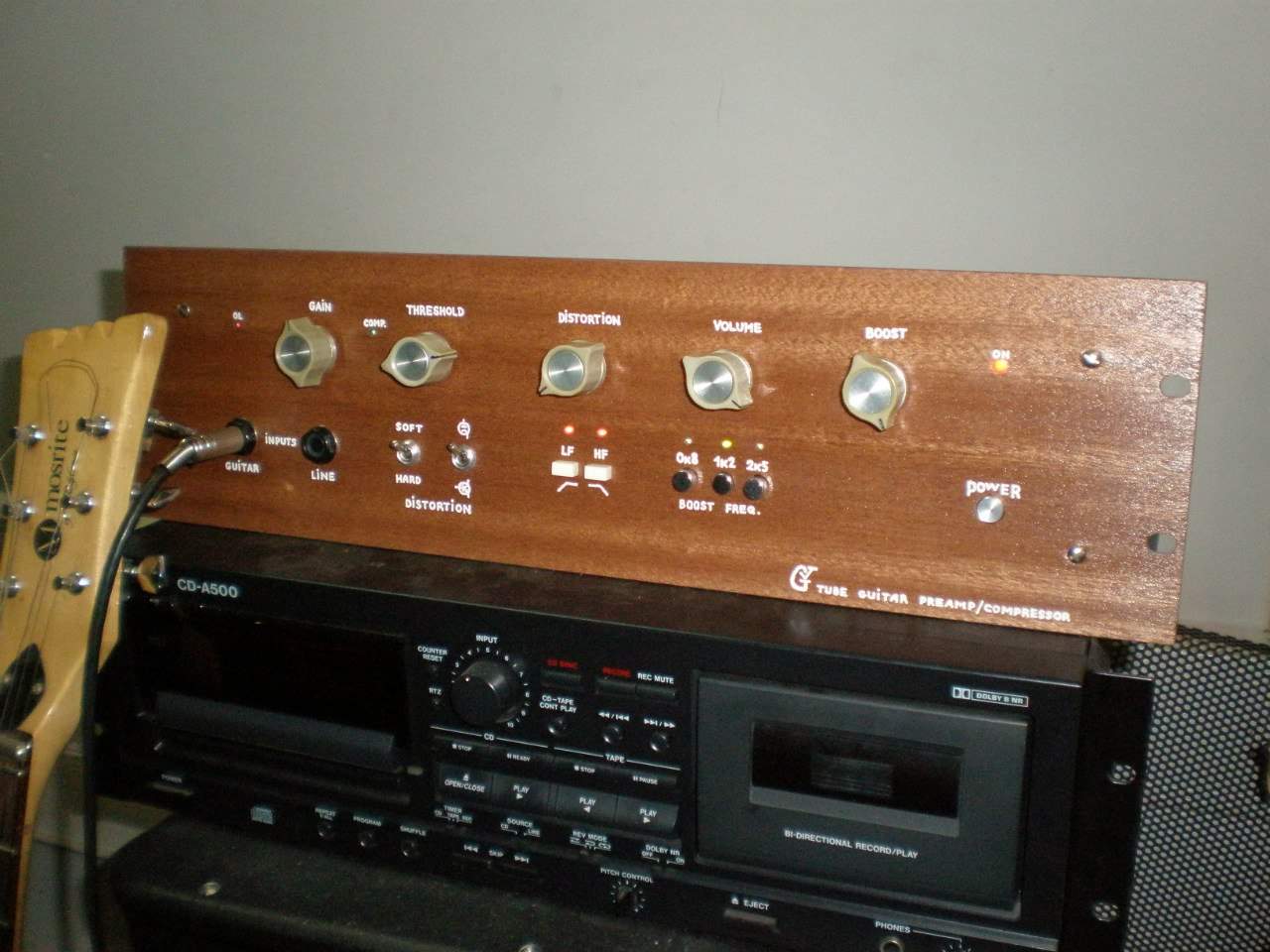 Минусы - сейчас все разложено на столе без корпуса (как на фотке выше) - слышен небольшой устойчивый фон, который пропадает если лампы, борду, тембрблоки прикрывать рукой, при условии что вторая рука лежит либо на струнах, либо на корпусе джека металлическом. Если рука "незаземленна" - то при ее поднесении - фон усиливается. Так же при отдалении инструмента фон тоже заметно снижается. Надеюсь, что вылечится корпусом, экранированными входными проводами и потенциометрами, у кторых корпуса тоже буду "на земле". Если не вылечится - то буду переходить на новальные лампы типа 6н2п, в экранированных панельках, и разбиратся с разводкой борда более лучшей.