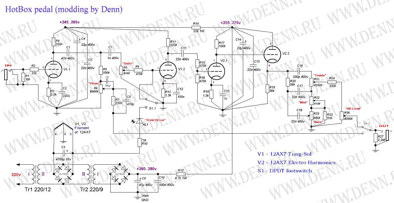 Немного воскрешу тему, подарили тут мне мастеровой hotbox сделанный каким то ростовским мастером, так вот, хочу пересобрать его на более аутентичных деталях по оригинальной схеме без каких либо модов, в тоже время отслушаю парочку рекомендованных модов от Дэна, как то кондер 1н перед гейном и потенциометр волюма включенный движком к выходному гнезду, если понравится сделаю на тумблере(рах) включение данных модов. Так вот в чем собственно вопрос, в оригинальной схеме Клин канал со своим потом 250к отрывается полностью от канала перегруза во время переключения, по схеме Денна же вход клин канала всегда соединен с каналом перегруза и тут рекомендованный кондер на 1 нан ставится нормально, а вот если его подключать к оригинальной схеме то он будет последовательно включен с разделительным 22 н. Подскажите как лучше поступить, можно конечно в с помощью тумблера включать в схему 1 н и одновременно притягивать крайнюю ногу пота Клин волюма через резистор 330к к точке соединения 22н и 1н, или же не критично оставить эту ногу пота постоянно подключенной к этой точке?