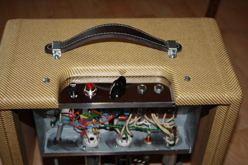 Плохиш, Данный Чамп не бюджетный, т.к. много чего покупал в америке на ебее, динамик Дженсен брал у Ерасова 1550 р., лампы не стал советские брать, а 6V6GT elеctro harmonics стоит у нас 600 руб., 12AX7 groove tube (это отборные Совтековские лампы идуще на конвеер Фендер) - 500 руб., 5Y3GT Sovtek - 400р. Вот тебе просто основные комплектующие! По поводу скоб ручки: были куплены в строй магазине обычные скобы, скруглил края напильником, затем шлифмашинкой отполировал до хромового блеска!