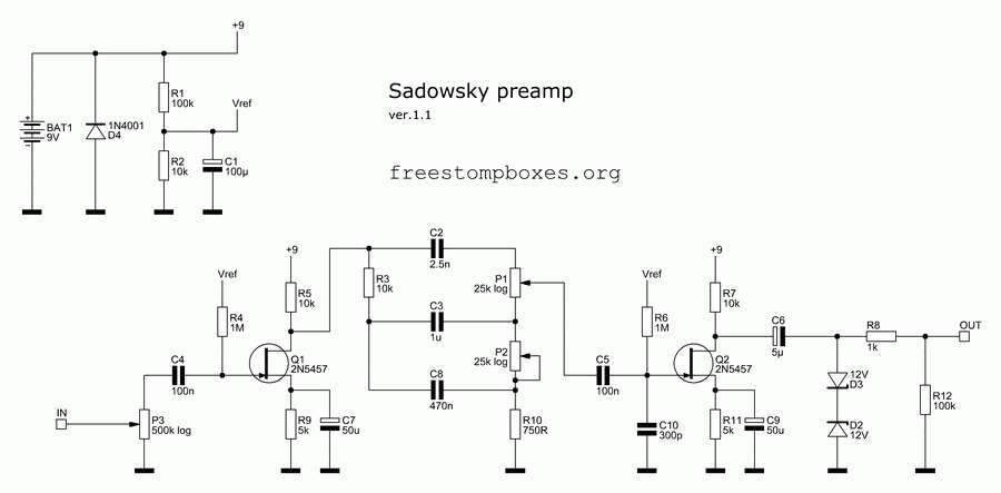 Возникла задача собрать басовый пред, и как ни странно готового проекта не нашёл, кроме знаменитого алембика на лампах и онбоард девайсов. Но мне нужно было что-то обычное транзисторное =). В общем вспомнил замечательный Fender rumble, и нашёл под него схему. Обрубил всё мне ненужное, переделал её на однополярное питание. К вам-же огромная просьба проверить, так-ли всё сделал.. ((( Печатка, и 2 pdf файла (оригинал и мой) в архиве прикрепляю..