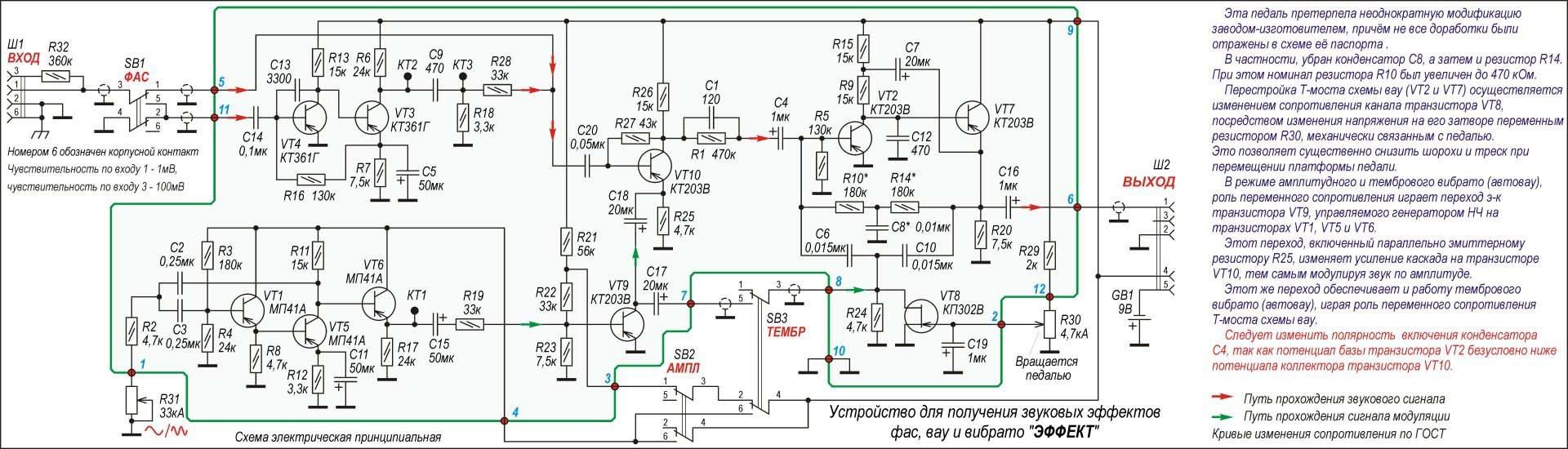 gretsch6119, "фузз" в нижнем левом углу схемы. Для регулирования его громкости нужно R18 (3,3к) сделать переменным, а нижний по схеме вывод R37 (33к) отпаять от КТ3 и припаять к движку этого переменника.