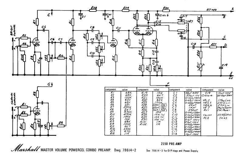 Есть дуал-лид фейсграйд, который подключаем к сожалению в инпут (так как там стерео разрыв) транзисторного Peavey Stereo Chorus 400 (2x12", 2x130 Вт). Нашли у одного старого рокера на пенсии почти нулёвый очень редкий комбик Marshall 2150 1979 года выпуска (3x12Ax7, 4xEL34, 100 вт, 1x12" Celestion Powercell) за 500 евро. Особенность у него - ручка громкости находится ПОСЛЕ фазоинвертора. Разрыва нету а хочется подключить преамп как полагается - не в инпут.