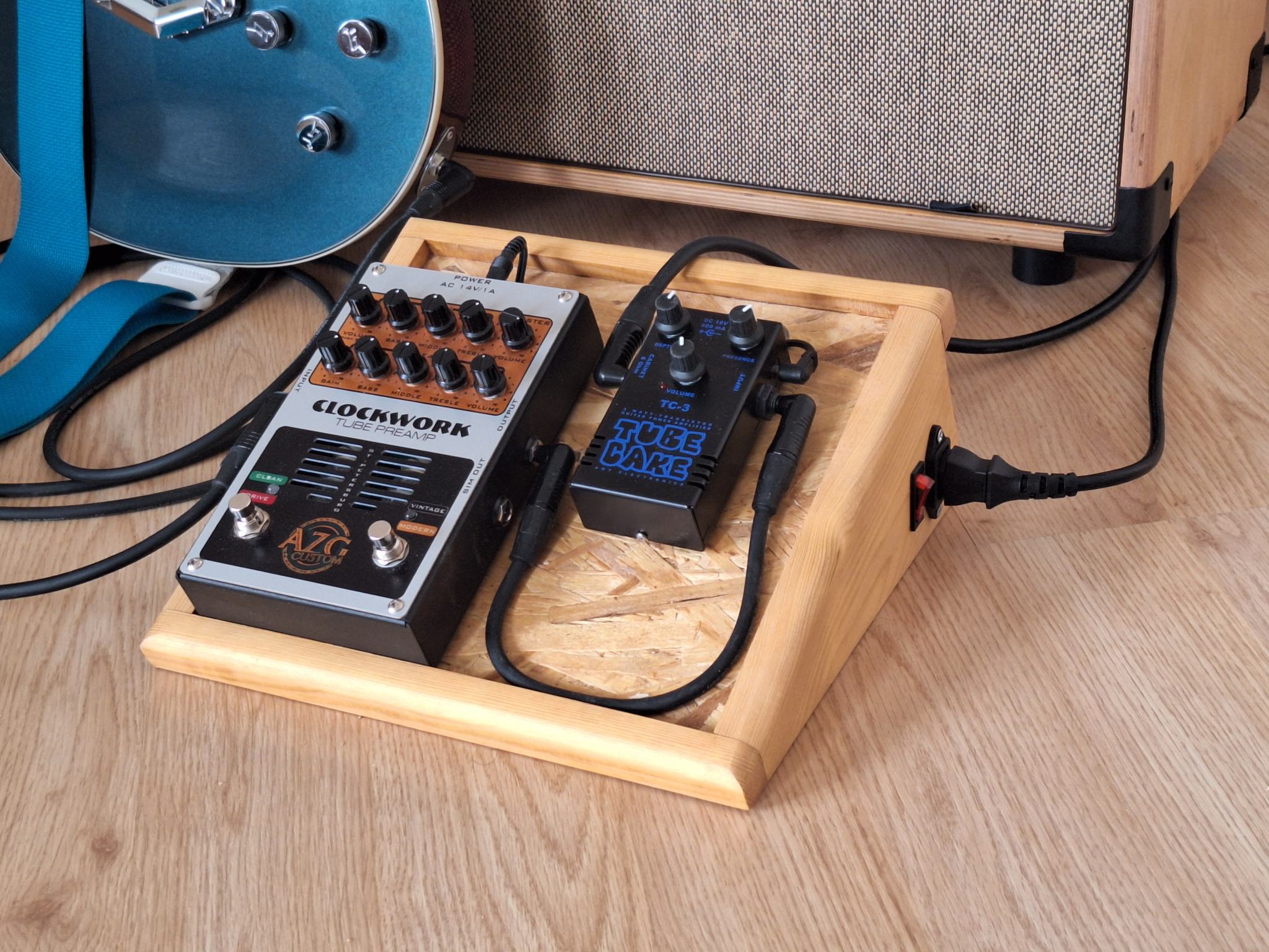 Между делом соорудил микро педалборд дабы как то избавится от бардака с блоками питания. Пока тока преамп на нем и тубкейк но есть еще место под еще что-то. Это что то судя по всему станет следующим проектом - какой нибудь tube screamer или fulltone osd.