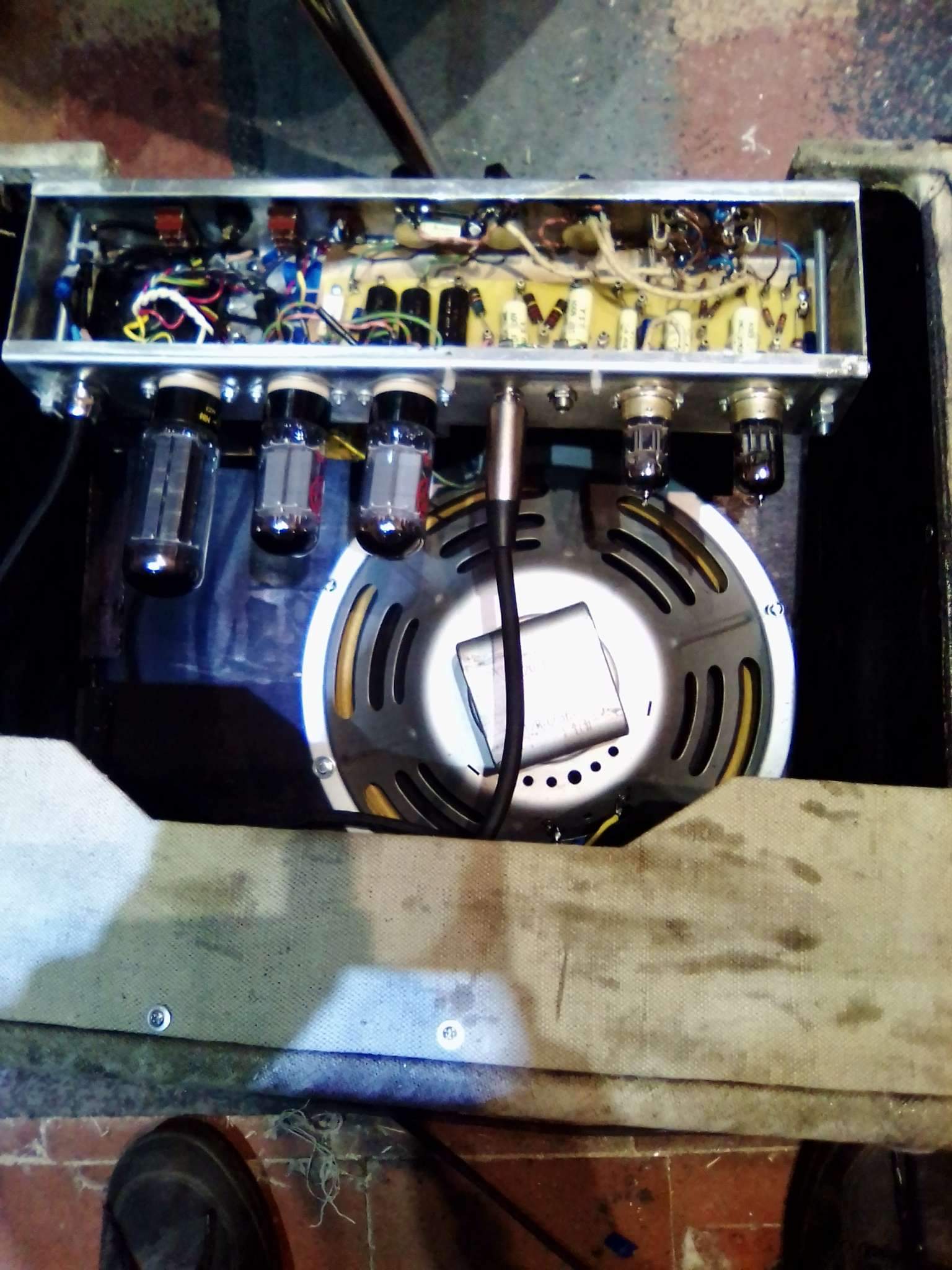 Ну само собой первым встал вопрос: голова, или комбо? Голова- универсальность применения, владею несколькими кабинетами, что предполагает универсальность, но все же вспоминаю свой старый МЕСА Ф-25, и грущу иногда... При этом иногда приходится выступать по маленьким клубам, пивнушкам, куда приходится тащить аппаратуру самостоятельно, ну и комбо- оригинальный форм фактор Дилакса... Благодаря подсказке Валентина Гаврилова (Валентин Федорович, мой низкий поклон) сделал ставку на EBay на Дженсен P12R 59 года, и вдруг ставка сработала, и примерно за 200$ я стал владельцем винтажного дина, которые ставились в оригинальные Дилаксы!!! Конечно же комбо! С дином вышла такая оказия: он вполне работал (импеданс кста 16 ом), но похрипывал... Вопросов- ноль, в родном Липецке знаю очень классного спеца по динамикам, не раз возил ему в ремонт всякую "фирму"- нареканий по работе- ноль! Привожу, а он:" Блин, а как тут подвес отклеивать? Я- не смогу, корзина хитрой формы, а алниковый магнит я ваабще трогать не буду, там Моджо сидит, разбираешь- и все, Моджо убежал!!!"