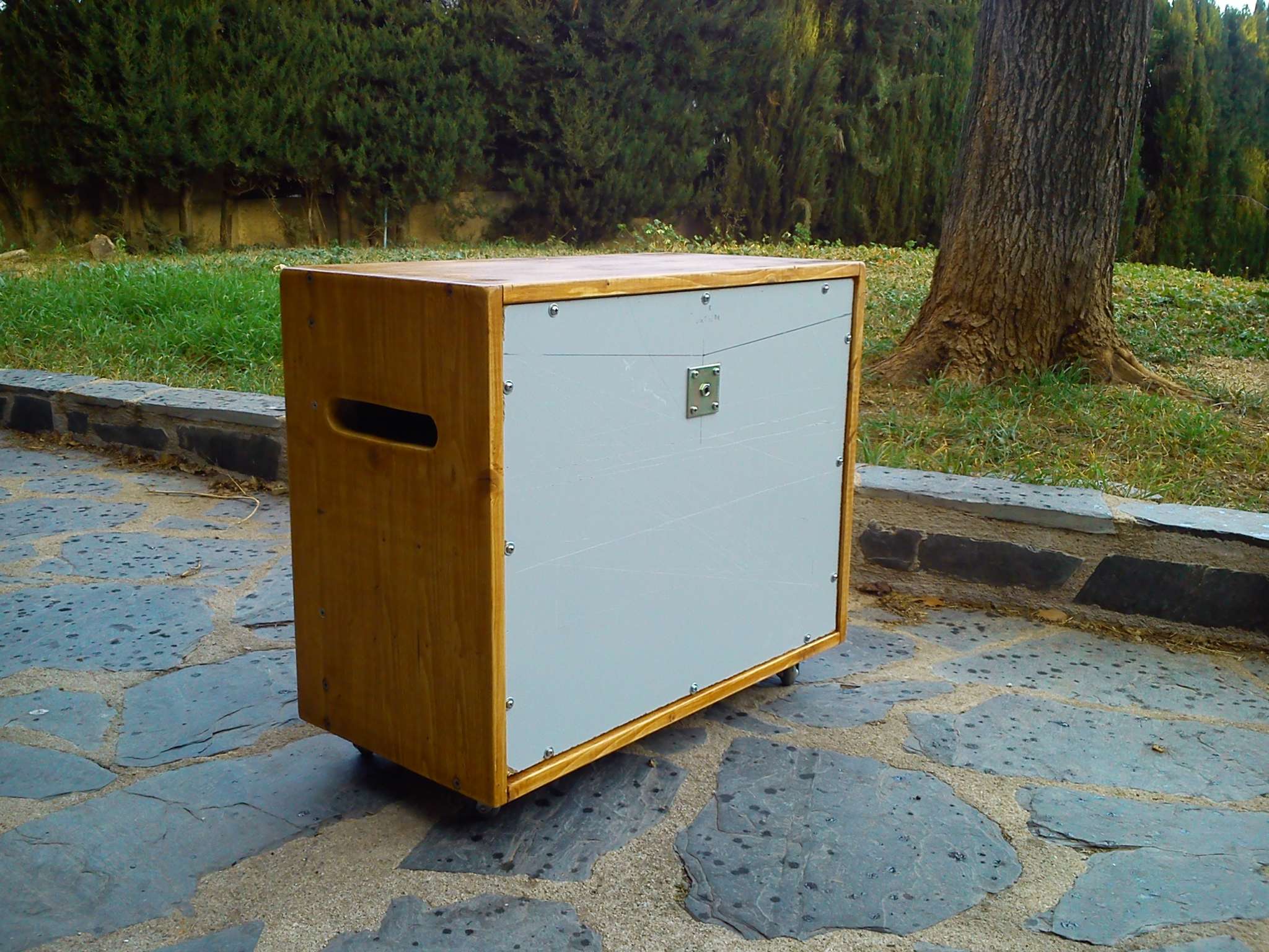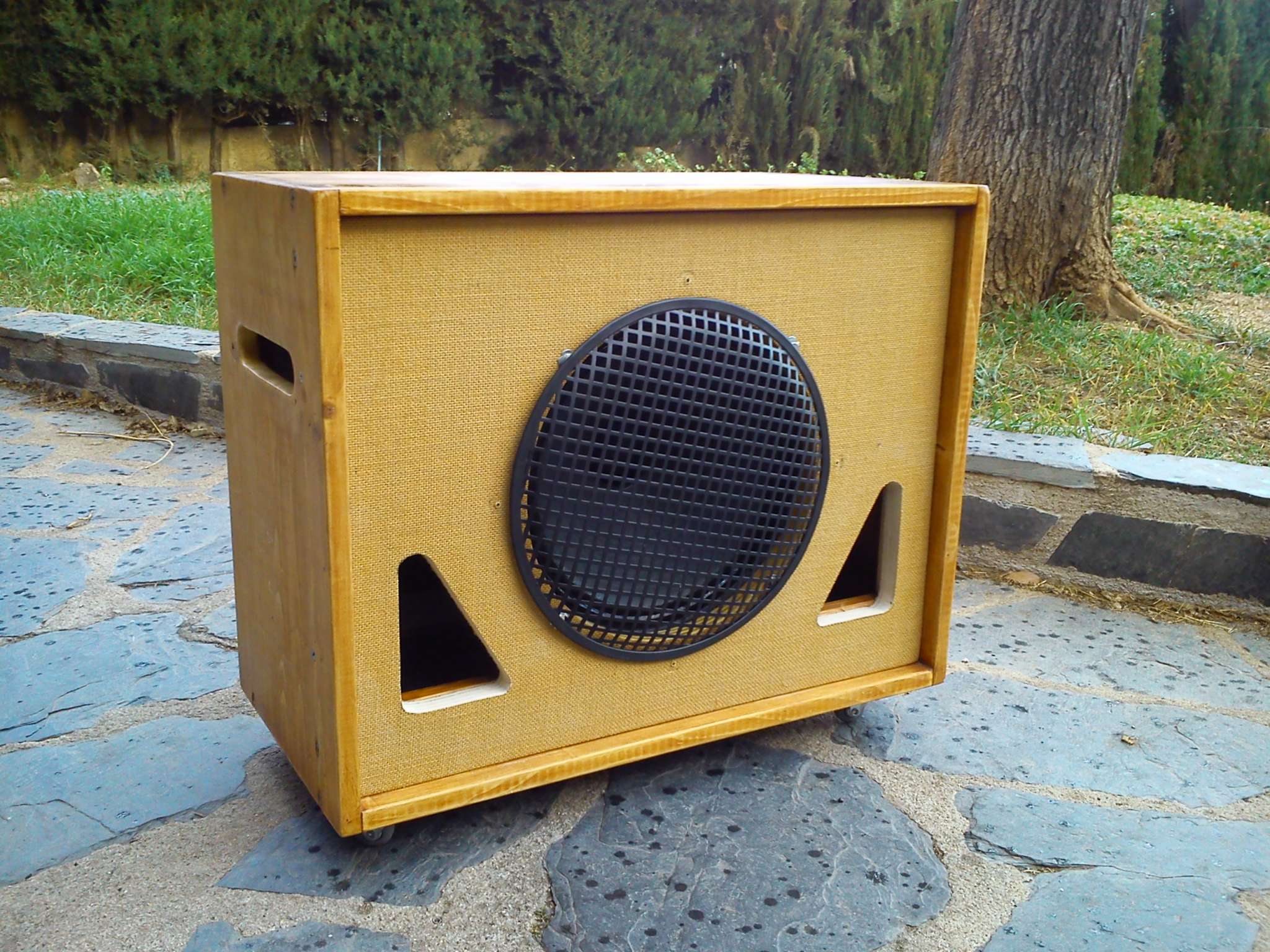 Когда задняя крышка была полуоткытого типа или точнее 1/3 открыта, то не хватало басов в звуке особенно при игре с перегрузом.Сделал заднюю крышку цельную, баса стало много и гундосость появилась хотя с перегрузом стал звучать убедительней.Решил заднюю крышку оставить цельной , а спереди сделать отверстия для выпуска "пара".Отверстия треугольной формы 37 сантиметров в обхвате. Звук стал лучше, более читаемый, без гундосости с хорошим колличеством баса в перегрузе и был бы даже рад еслиб не одно но.