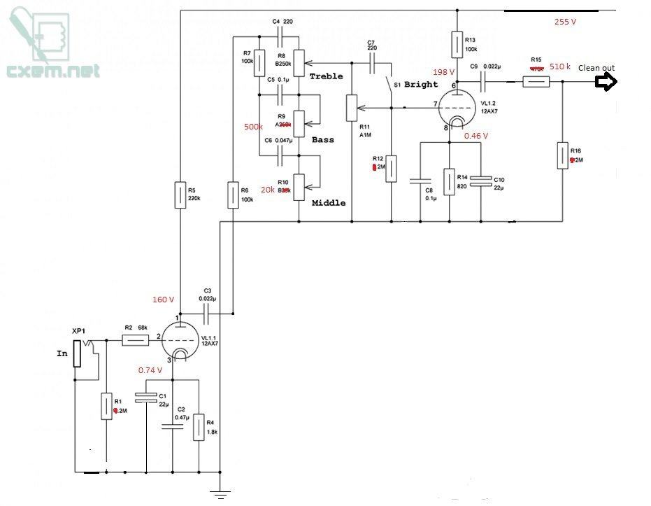 Требуется квалифицированная помощь с данным устройством(самодельный ламповый двухтактный усилитель на 6п6с для гитарных дел), сразу оговорюсь это первый мой проект, опыта 0, но руки и голова рабочие. В общем дело в том, что стал клиппинговать усилитель даже на минимальной громкости, причем клип происходит в атаке, но если прибавить громкость и без атаки клипует)))). Общее описание устройства: 1) Двух канальный (один чистый схема в приложении, второй канал пред. от ректифаера красный канал) 2) Блок питания прототип ректифаера с переключением на кенотрон, дроссель советский 5Гн, силовой трансформатор. от аудиоинструмента с макс током 180мА, накальный ТН-46, смещение фиксированное свое на каждую лампу(очень удобно!!!) Схемы во вложении, какая еще нужна информация все предоставлю (все напряжения где надо померяю, lay-файлы имеются, нет осциллографа). Есть один нюанс! когда собрал впервые боролся с фоном конечно, но все поборол все отлично играло, естественно мне же мало(лучший, враг хорошего) я решил переделать плату чтоб проводочки к клеммам подключались))))), было на пайке и тут началось. Прошу совета откуда берется клип???