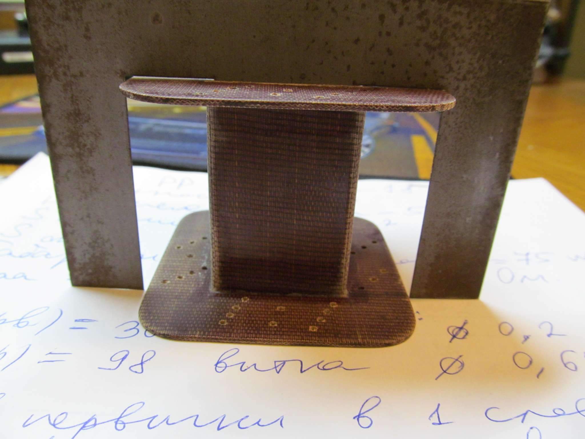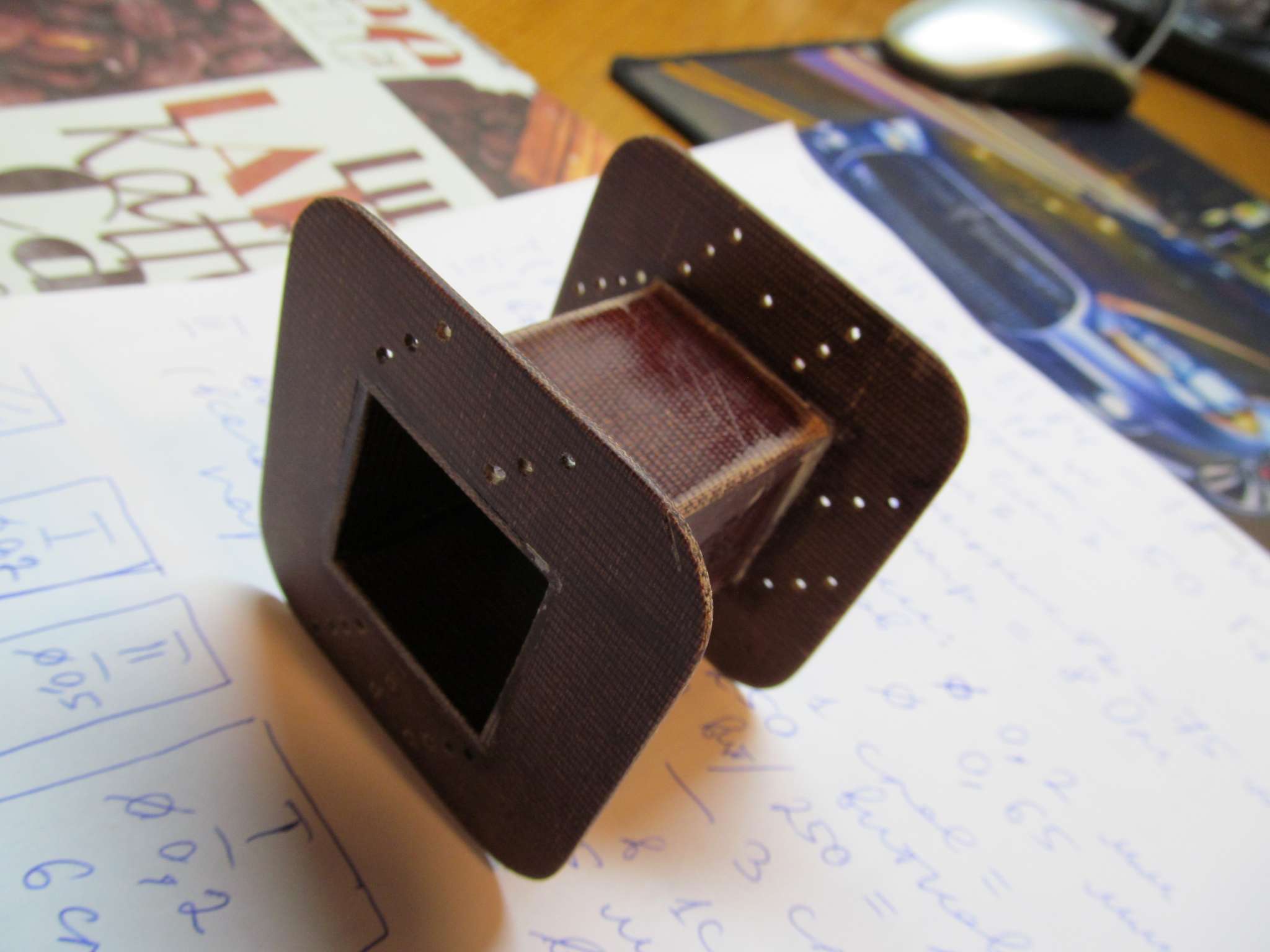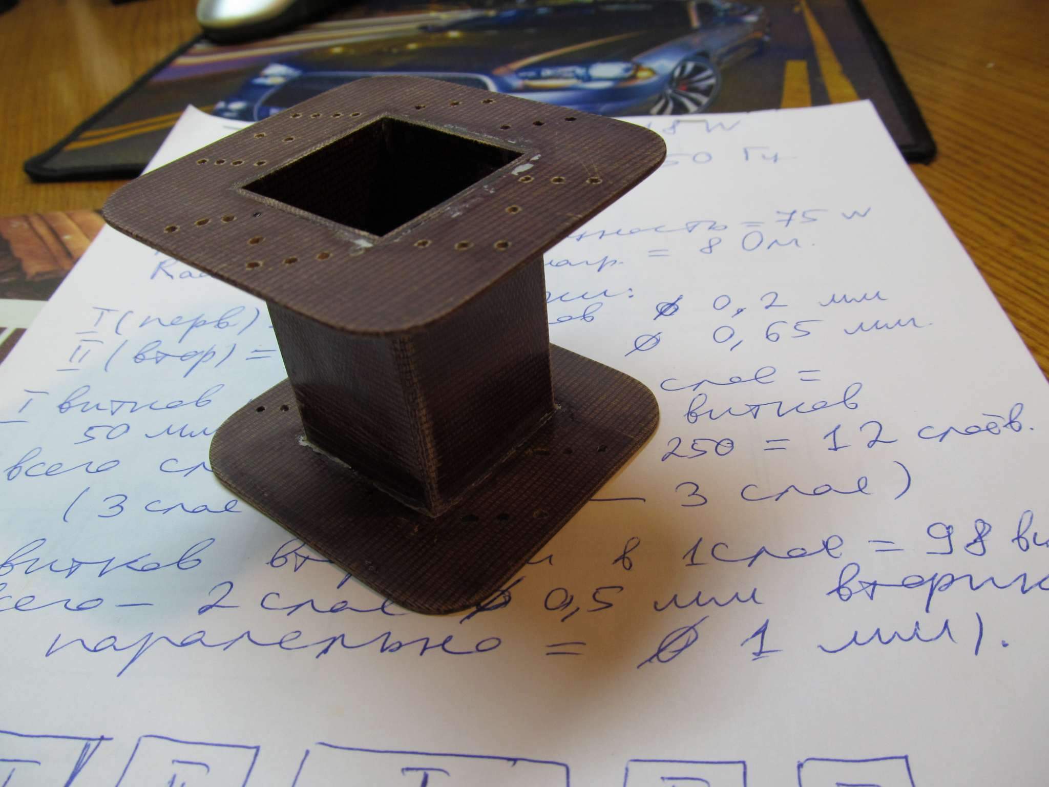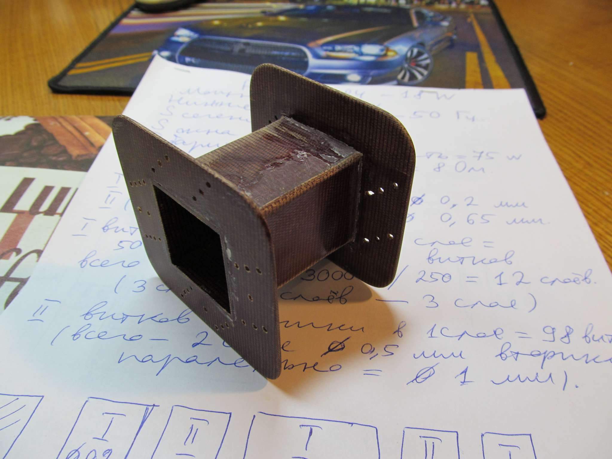Склеил каркас из 2 мм гетинакса , вроде более-менее ровно вышло , чуть подправил конечно всё напильником с наждачкой )) . Это уже второй мой самодельный каркас ( первый был под дроссель) . Всё вырезал с помощью ножовки по металлу , дрели , и напильников с рашпилем. К сожалению, пока бормашины с фрезами нет(( . Клеил на суперклей , когда всё схватилось, то позаливал все щели эпоксидкой. Вышла очень прочная конструкция.