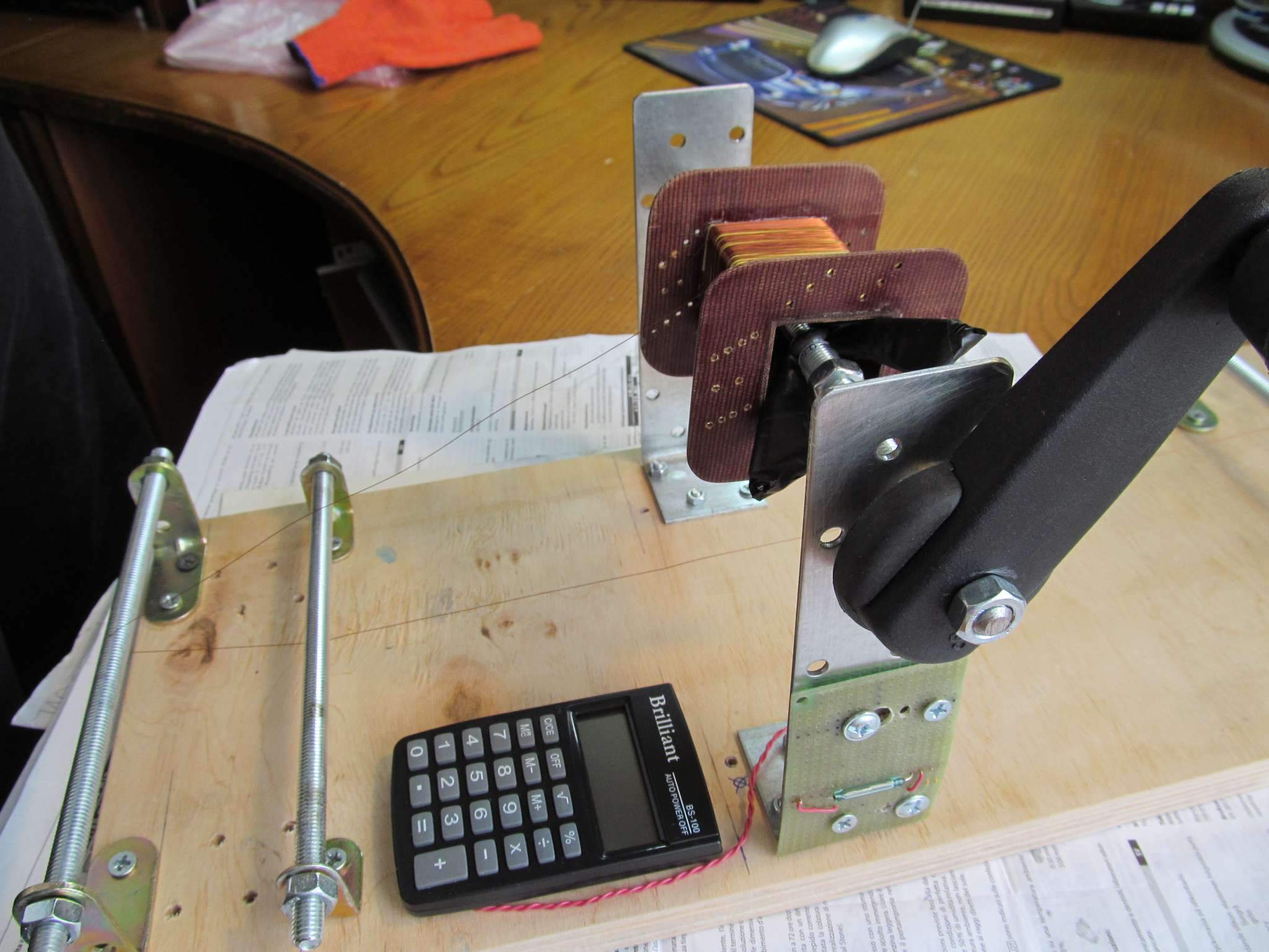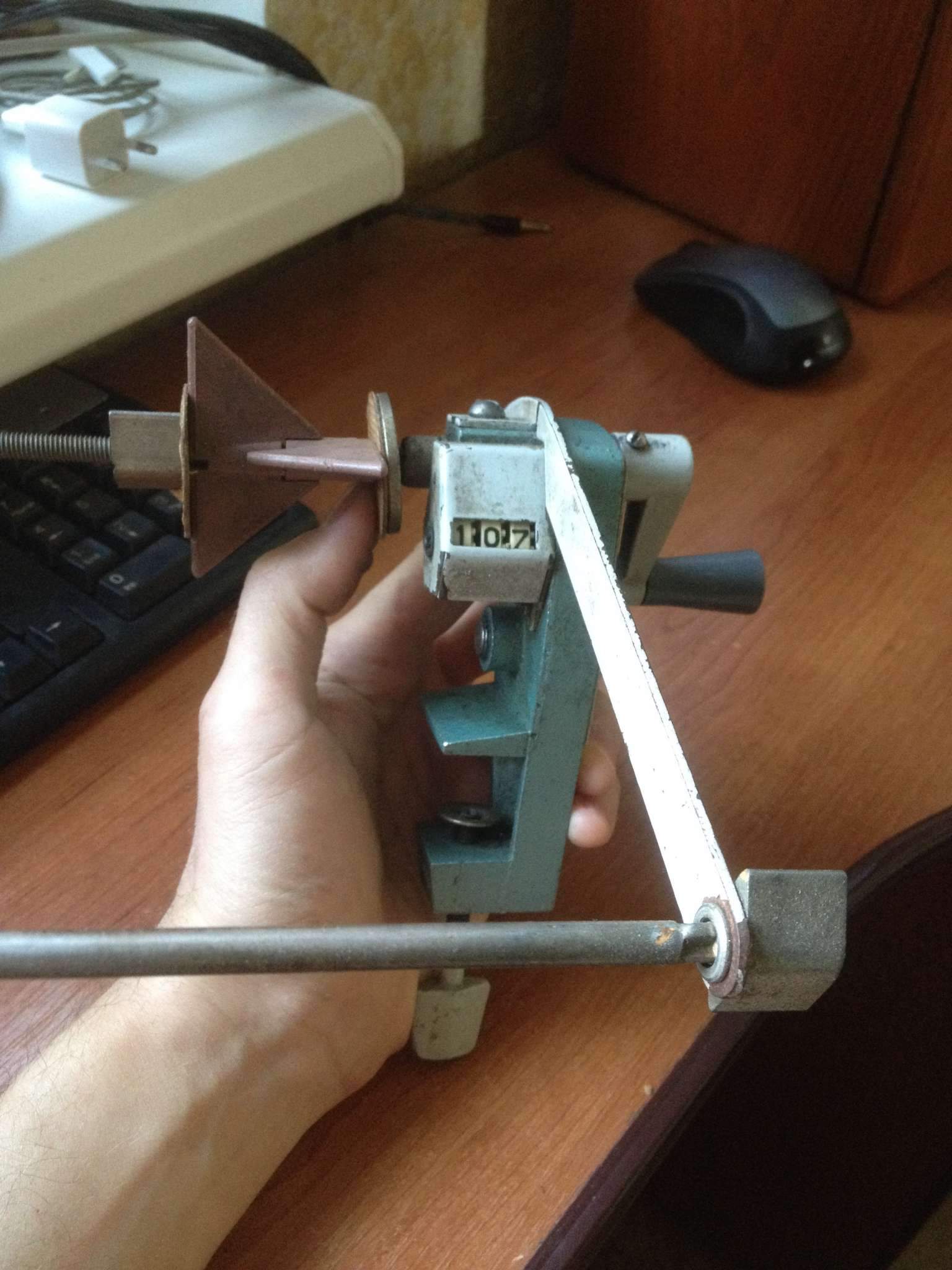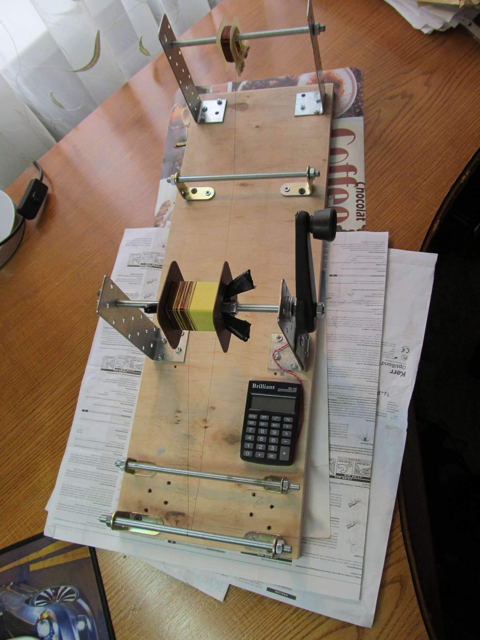 Вот , почти доделал станок моталку со счётчиком витков. Осталось только сделать натяжитель провода после подающей катушки , найти пластиковые трубочки на направляющие оси ( уже знаю где их взять) . Всё делалось из подручных материалов ( ручку купил от стеклоподьёмника на девятку на авторынке , пруты с резьбой и уголки- в стройматериалах. Единственное, над чем заморочился- это барашки-зажимы на резьбе для фиксации каркаса на оси. Купил маленькие барашки с резьбой на 8 , вырезал лопасти- удлинители , и приварил . Потом обмотал лопасти изолентой с подкладками для лучшей фиксации. Фиксирует каркас реально очень прочно , лучше чем обычные пластины текстолита. Таких готовых больших барашков нет в продаже нигде, нужно всё дотачивать самому. Калькулятор нашёл нормальный , с платой внутри, припаял провода к геркону к дорожкам кнопки "=" . Нажимаю 1 + и = , начинаю мотать и калькулятор считает витки. Это если быстро крутить, без задержек. А вот если мотать в реальных условиях катушку виток к витку, то постоянно где-то останавливаешься, чтобы направить правильно провод, ручка немного задерживается возле датчика, и калькулятор очень часто считает два витка подряд ( датчик срабатывает не один раз, а два) . Думаю, что причина может быть в отсутствии натяжителя провода, поэтому попробую ещё с натяжителем- тормозом. Пока тренируюсь наматывать на ненужном проводе.