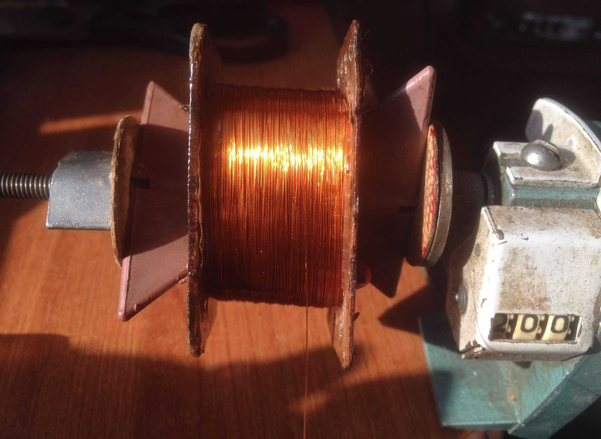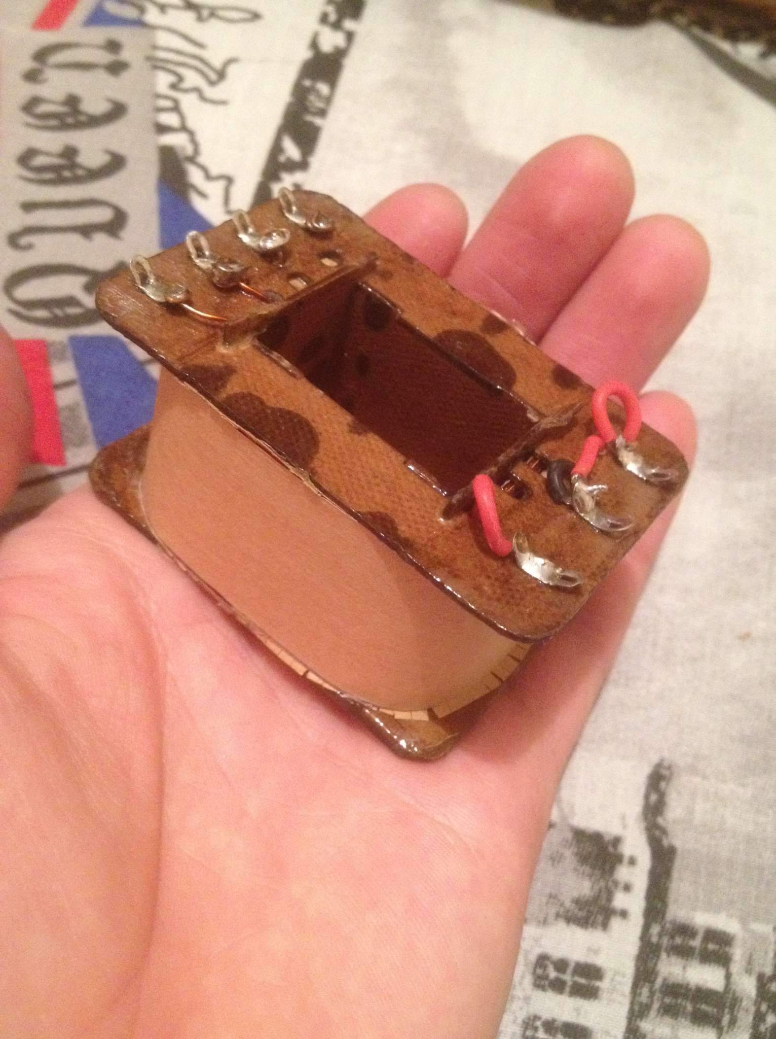 Намотал еще один выходничок. Двухтакт. Под пару 6V6 или EL84. Приведенка 8k. Вторичка на 4, 8 и 16 Ом. Железо и каркас взят от неисправного выходника катушечного магнитофона Днепр 12. Каркас сильно пострадал, видимо, условия хранения были очень неблагоприятные, каркас перекосило, щечки были сильно деформированы. Размотал старые обмотки, разобрал на части каркас, прогладил каждую детальку утюгом, чтобы выпрямить, собрал. Затем проклеил цианоакрилатом для прочности, и пропитал лаком. Каркас стал жёстким и монолитным. Хотя внешний вид у него по-прежнему, неприглядный. Ну да ладно, не на выставку. Начал мотать сначала вторичку, 4-х Омную часть обмотки, проводом 0.6 мм, 53 витка. Затем намотал половину первички, 1200 витков проводом 0.18 мм, внавал, с межслойной изоляцией из промасленной конденсаторной бумаги через каждые 120 витков. Далее намотал 8-Омную часть вторички, 22 витка проводом 0.6 мм. Затем вторая половина первички, и сверху третья, 16-Омная часть вторички, 32 витка проводом 0.6 мм. Вторички все последовательно. Получилось впритык, на каркасе с трудом уместилось. После намотки катушку проварил в воско-парафиновой смеси, около часа, пока все пузырьки не вышли. Почистил от ржавчины и покрасил обойму трансформатора, изготовил нижнюю крепежную пластину с отверстиями для крепления на шасси.