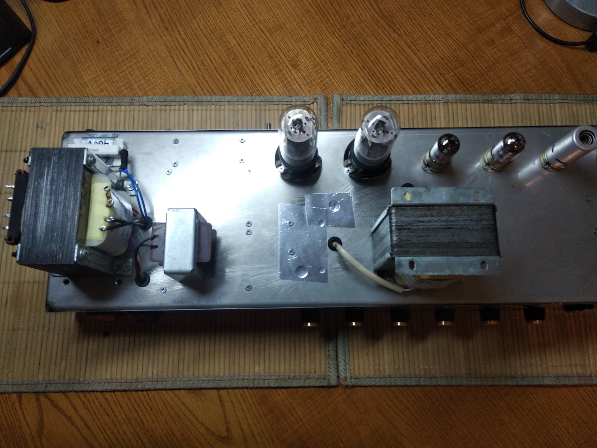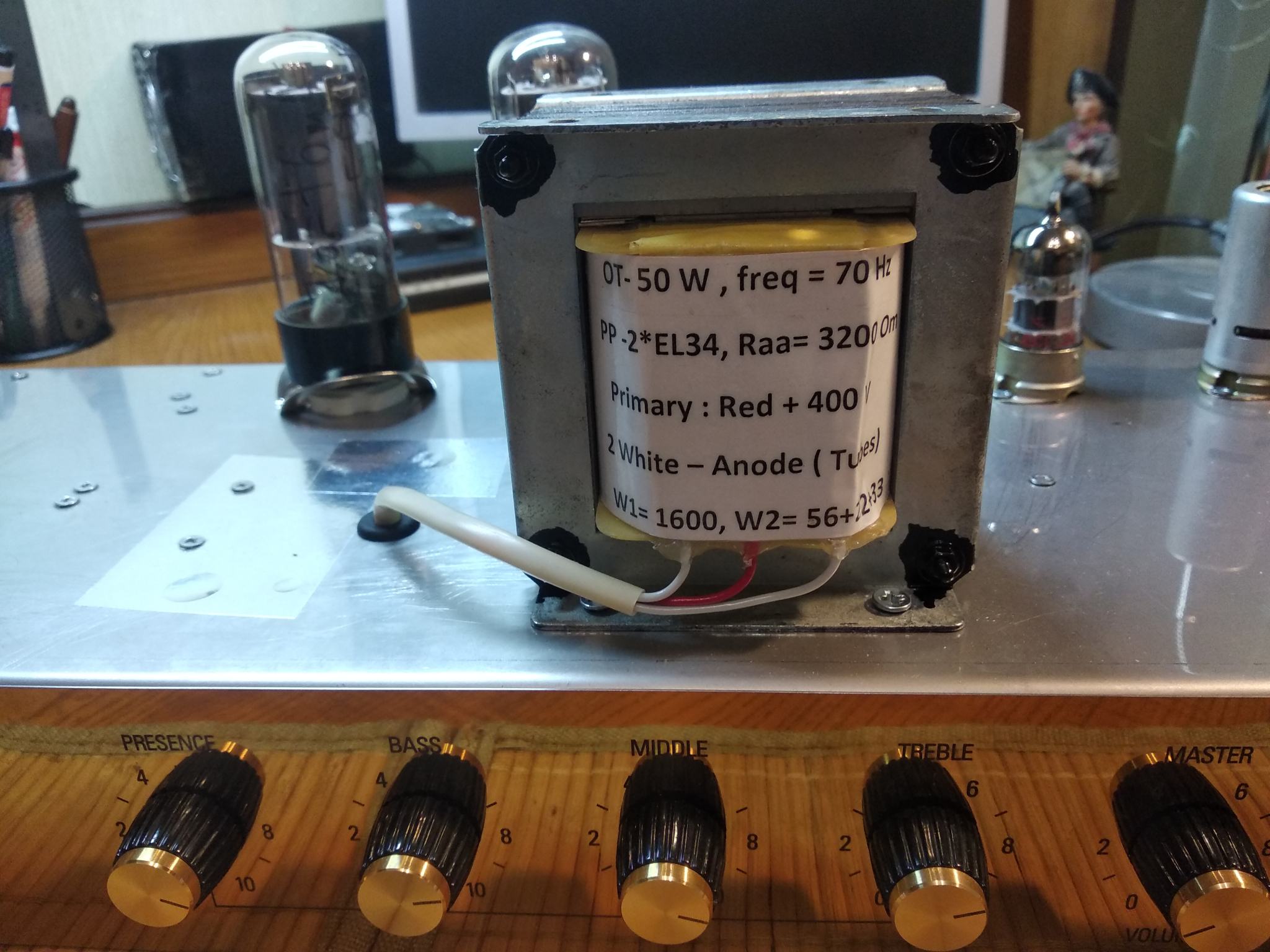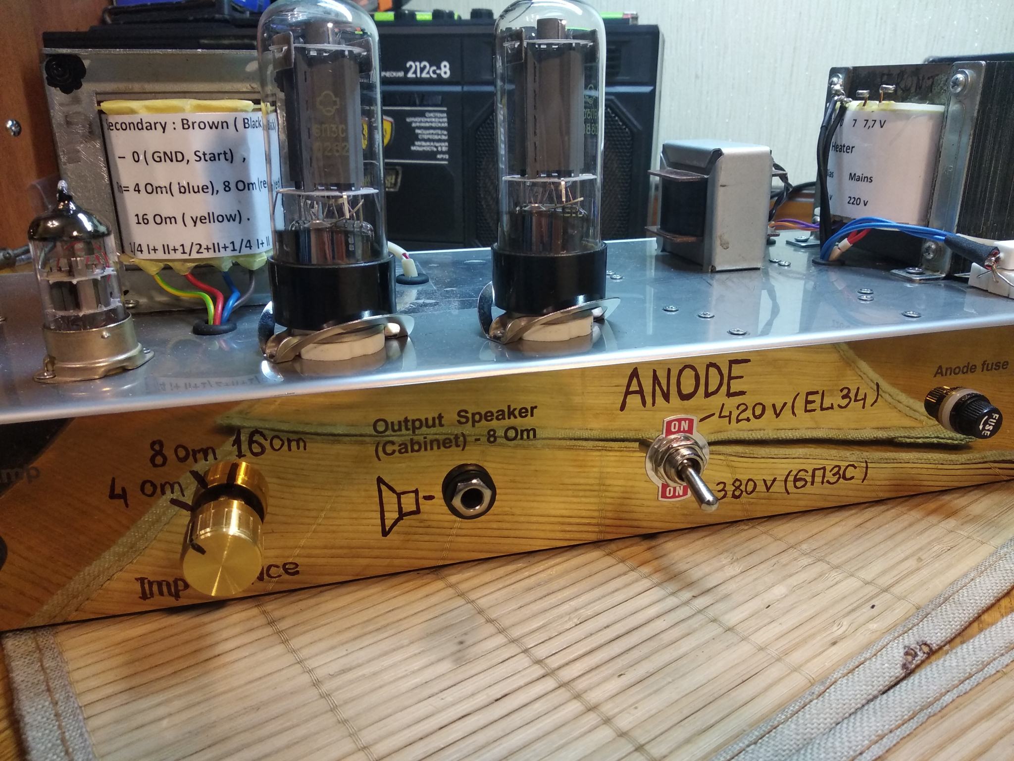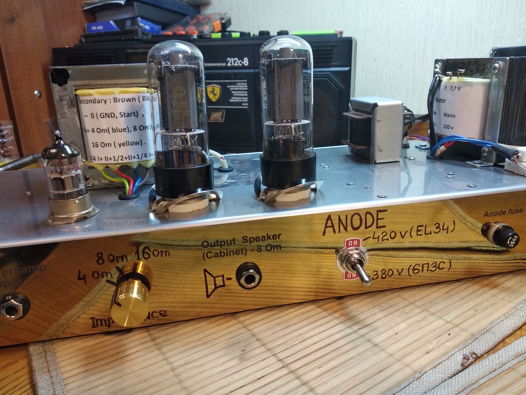 Пока нет возможно купить новые EL34, а старые умерли полностью. Для тестов звука поставил пару 6П3С в оконечник. Режимы соблюдены , анодку сделал переключаемой ( 380/420 В). Выходник с выходами на 4, 8, 16 ом , под приведенку 3,2 кОм.