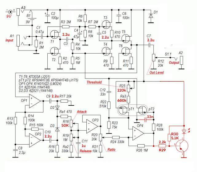 Могу предложить неплохое решение проблемы шумов. Я предлагал померить Кус, но не дождался результатов, хотя и так понятно - он сильно избыточен (в симе более 50 дБ), поэтому и шумит сам компрессор. Можно R7 заменить на цепочку из подстроечника 1 МОм - "Gain" и последовательно с ним 50...100 кОм. С5 увеличить до 22...47 мкФ. Дальше поступить так: Gain - на максимум, "старыми" регуляторами установить максимальную компрессию. Уменьшая Gain, найти верхнюю (юзабельную) границу компрессии, шум при этом должен уменьшиться. Основным регулятором компрессии остаётся Treshold, а Gain - подстроечник.