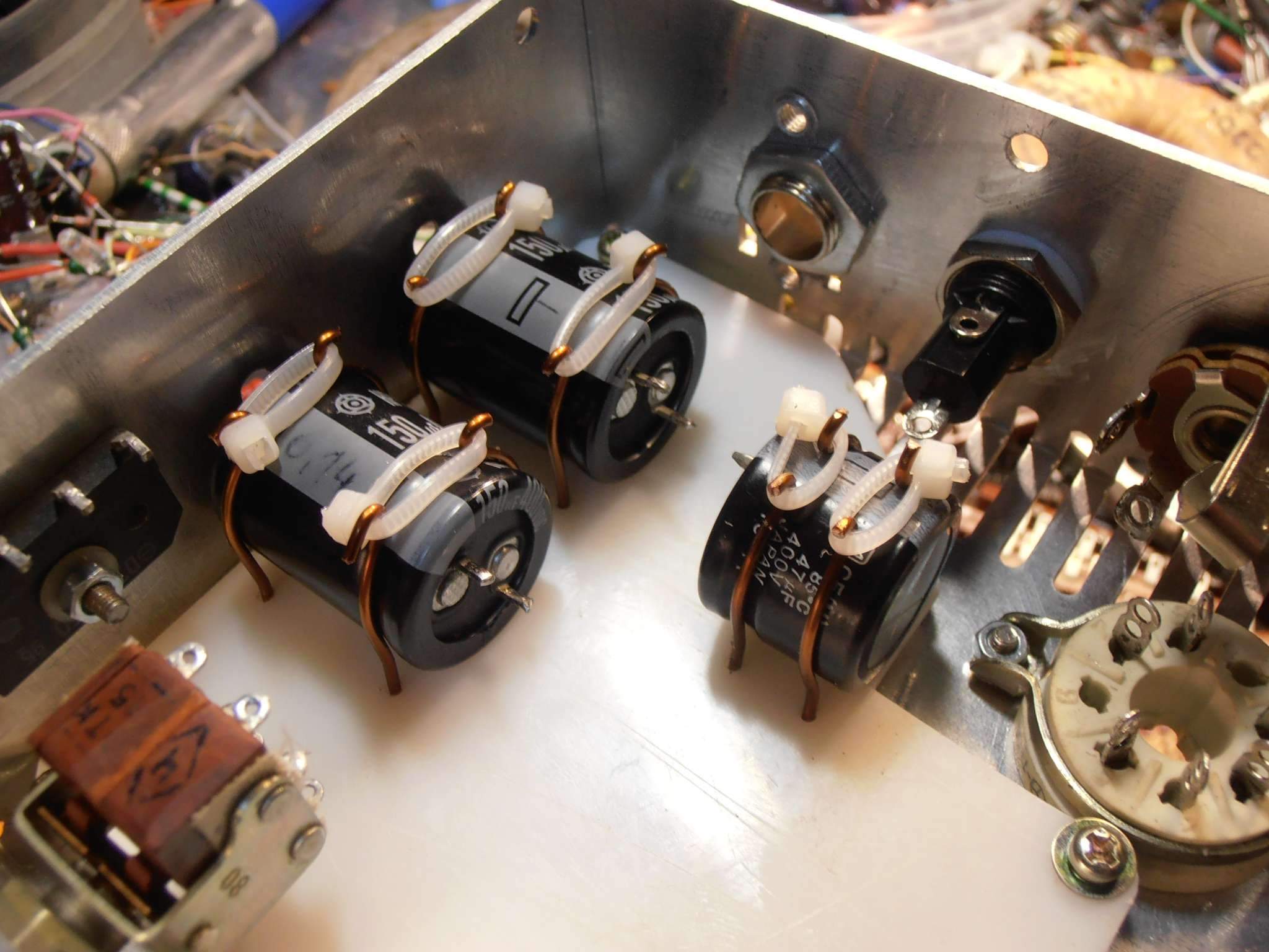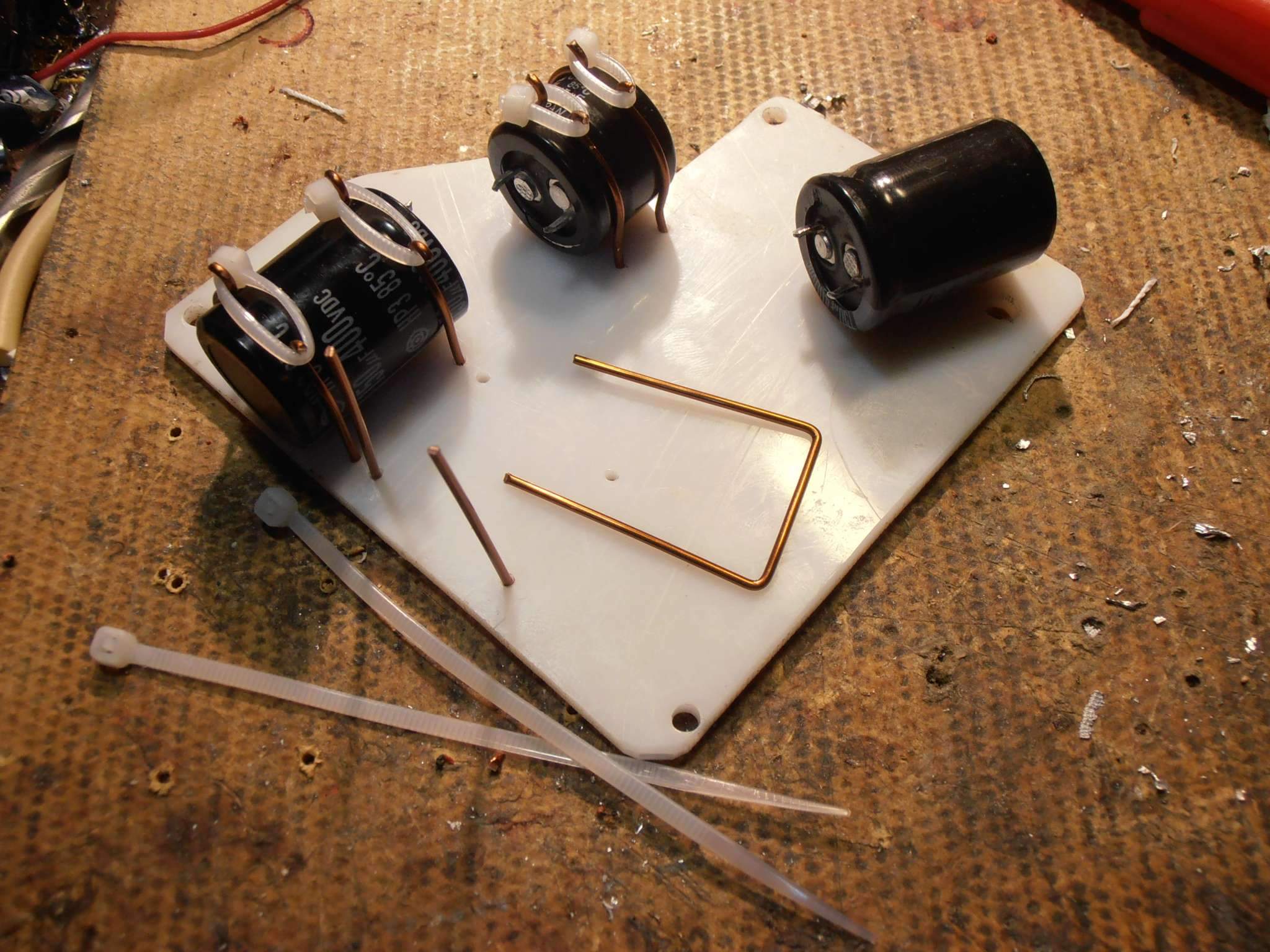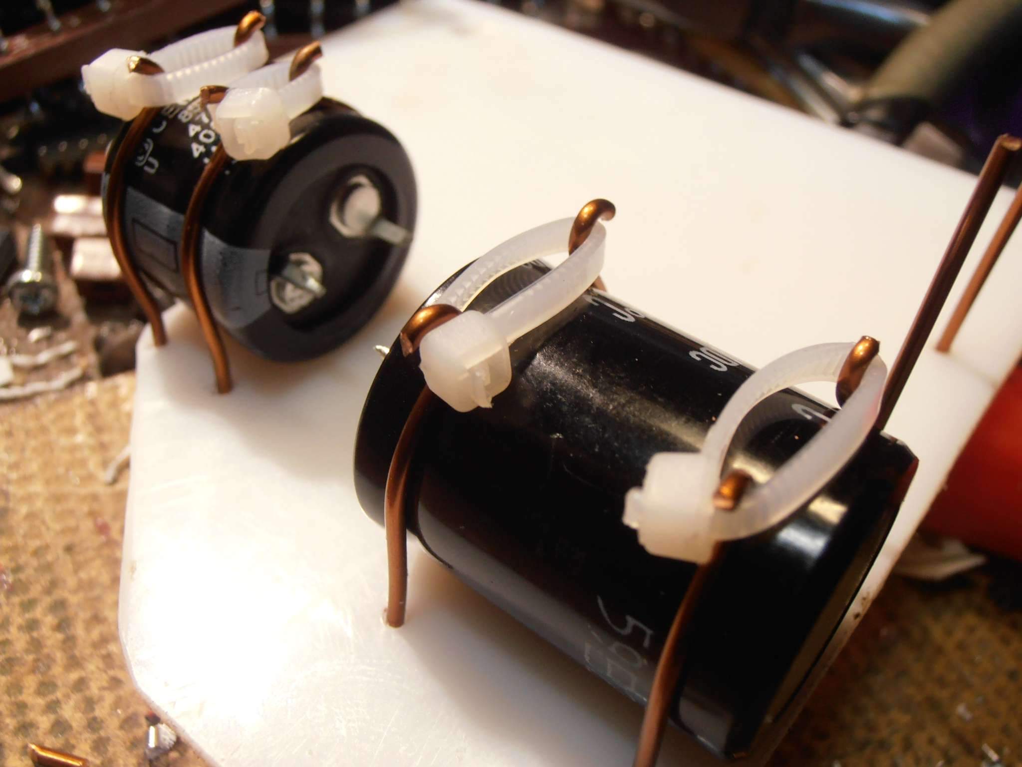 Маленькое практическое замечание от электромонтажника, который стяжки использует тысячами и потом "наблюдает" за тем, что стянуто, годами))). Часто попадаются стяжки, которые со временем (и быстро - пол-года, год) пересыхают. Замок перестает держать и ослабляется. И даже сама стяжка становится хрупкой и трескается. При способе, предложенном топикстартером, кондеры повиснут на одних лишь монтажных проводах. И куда они укатятся, и что там коротнет тогда?..Крайне ненадежно. А уж вид - прошу прощения, но совсем колхоз. Поэтому - банки с "клыками" либо паять в печатные платы стоймя, как это и предусмотрено, либо - если хочется их положить - то короткими отрезками моножилы от клыков в айлеты или к стойкам. Демпфер - капля термоклея, стяжки - как показал alkuz.