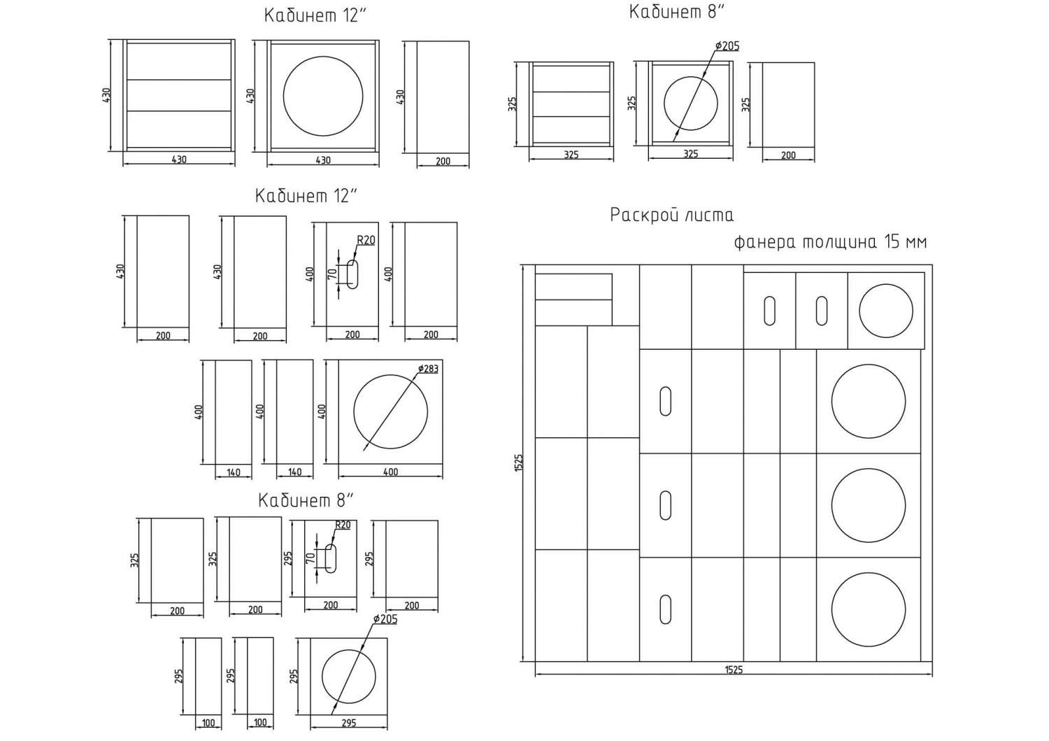 8" кабинет спроектировал максимального возможного размера, какой можно получить из остатка после 12-дюймовых. Глубина тоже 200 мм.