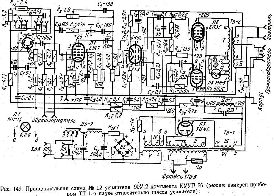 Подарили поломаный 90У-2, поциенту удалось его малость оживить, выпрямитель, фильтры и дроссель питания просвечивающей лампы удалил, обвязку звуковой лампы и делитель звукоснимателя тоже удалил, вход на сетку 6ж7 выполнил по типу гитарного (1м, 68к ) усь неплохо ( насколько позволяет эта элементная база и схема