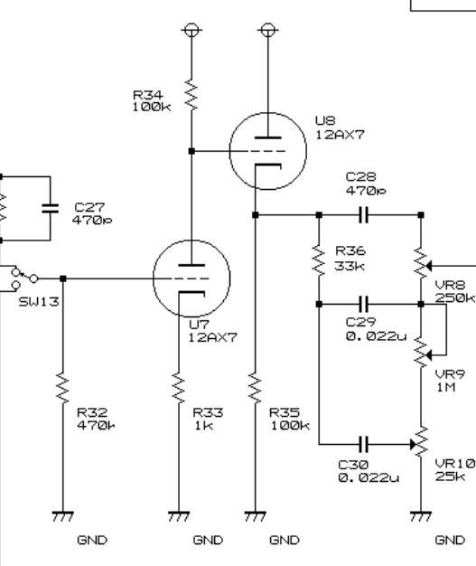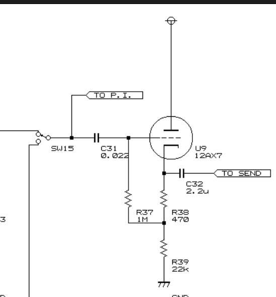 3) Входная ёмкость каскада минимальна благодаря двум моментам: отсутствию эффекта Миллера (ёмкость С-А не умножается, т.к. анод "не шевелится") и уменьшению ёмкости С-К, т.к. напряжение на катоде практически повторяет входное (на сетке), т.е. сигнальный ток через эту ёмкость уменьшается, что эквивалентно уменьшению действующего значения ёмкости С-К (умножению этой ёмкости на [1 - Кус]). А это означает, что каскад сохраняет высокое R_вх и на ВЧ, т.е. это каскад весьма широкополосен. Правда, в гитаристике это свойство не востребовано. Кстати, благодаря повторению напряжения и на R37, входное R на постоянном токе... НЧ увеличивается в 1/(1-Кус) раз - механизм тот же. Иногда это называется "виртуальное уменьшение ёмкости" и "вирт. увеличение сопротивления сеточного резистора".