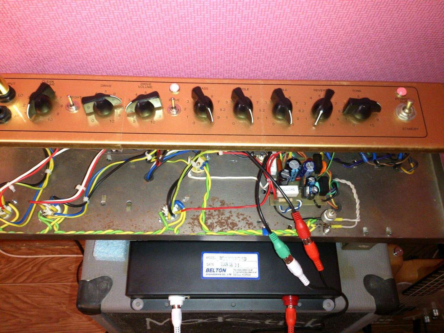 Скажу честно – то, что аппарат заработает сразу я сильно сомневался, всё таки первый раз на печатке ламповый усилок делаю, а тут всё работает и вроде всё устраивает, терзал домашних наверно около часа, проверял так и этак работу на разных режимах пока жена не заворчала. Появилась даже мысль, что если бы делал себе, то на этом можно было бы наверно и успокоиться. Но так как аппарат “заказной” успокаиваться рано, поэтому достал распечатку осциллограмм, заменил динамик на нагрузочный резистор, подключил генератор и осциллограф решил всё таки не доверять ушам, а сделать проверку по научному. На моё удивление осциллограммы почти соответствовали “оригинальным”, пришлось кое-что немного доработать, но это совсем уже мелочи. Оказалось из-за регулятора драйва – 1М/100К я найти не смог, поставил обычный 1М/1М, а зашунтировать один движок резистором забыл. Поигрался с сопротивлениями, подобрал номиналы, чтобы осциллограмма похожей была, ещё раз проверил покаскадно и решил угомониться пока не испортил чего-нибудь. Надо признаться, что такая компоновка может быть для производства и хороша, но для доработок и внесения изменений крайне неудобна, приходится всяко немыслимо изворачиваться, чтобы что-нибудь перепаять или заменить. Из доработок ещё увеличил коэффициент усиления каскада выхода на ревер, всё таки маловато его показалось, а при добавлении регулятором на максимуме появляется фончик, даже скорее это шум операционника, из-за слабого сигнала выхода ревера + наводка на длинный, хоть и экранированный провод выхода ревера. Вот не помню, вроде в оригинале так же было, но нам этого не надо, поэтому решил всё таки доработать, увеличил амплитуду сигнала на вход ревера почти в два раза, теперь в принципе ручку ревера больше 5-6 крутить не приходится. (к сожалению на оригинале померять эту величину я забыл, остаётся надеяться, что МС выдержит увеличившийся ток нагрузки) Сейчас ожидаю визита будущего владельца, посмотрим как аппарат ему - понравится или нет, правда я его гоняю на Celestion Super 8, а он вроде планирует искать родной Celestion G12H, так что может ещё придётся кое что подстроить, но основная работа уже сделана.
