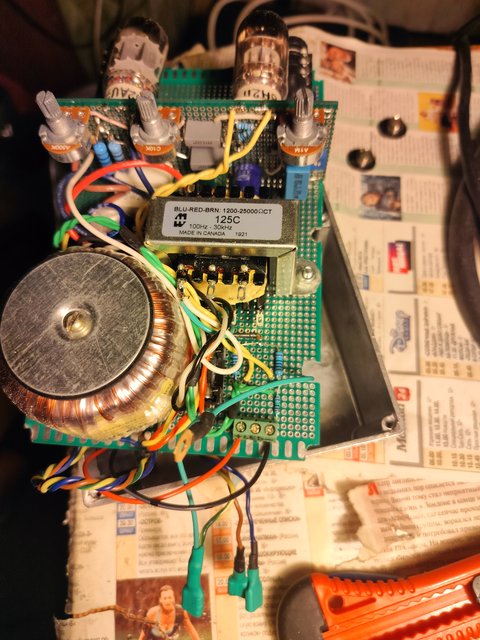 Внутри живут две лампы(фазик на 6н2п-ев и мощник на 12au7), силовик, как в Chaos Zero , и выходник Hammond 125C.