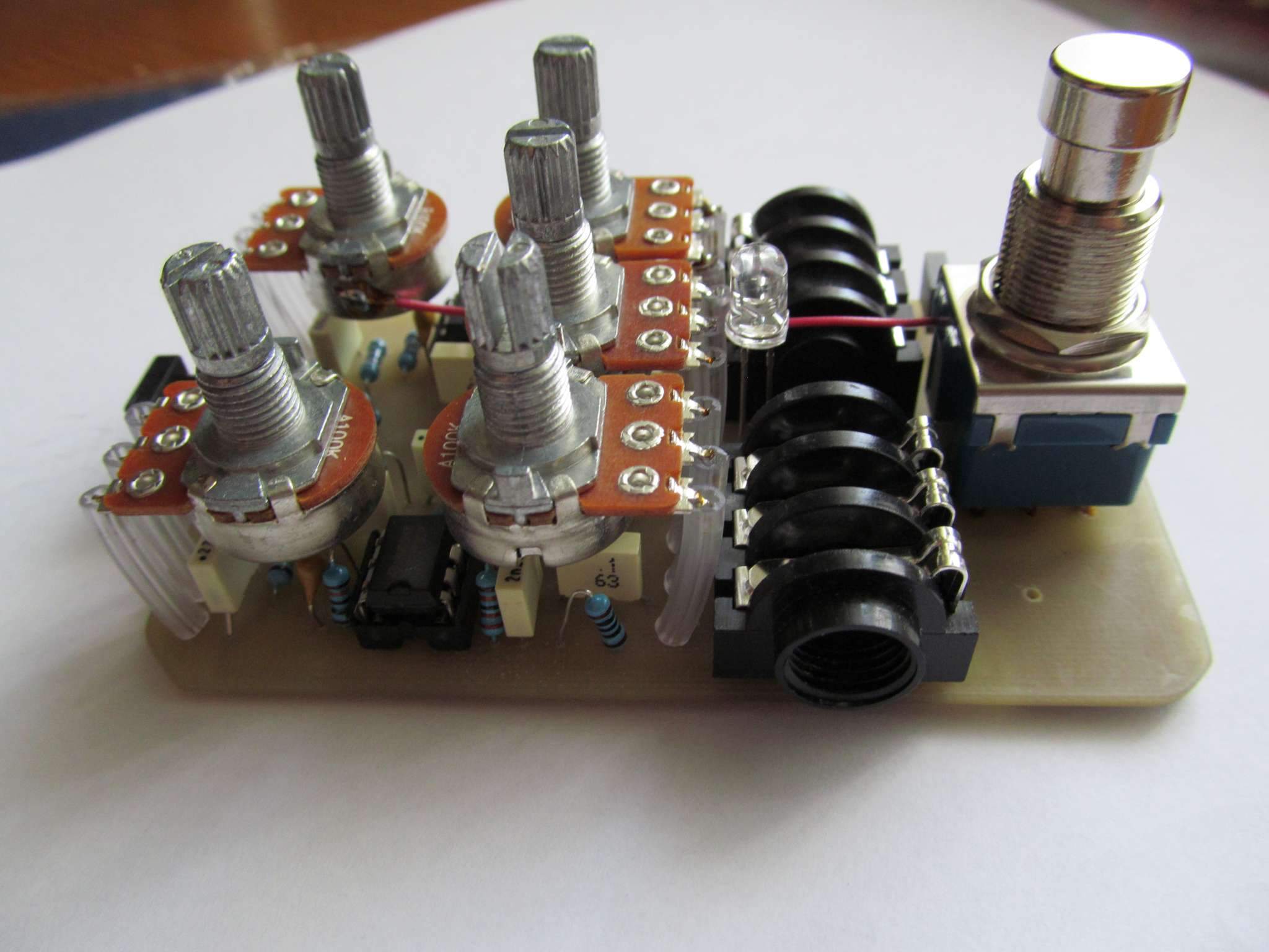 Давно хотел спаять именно эту примочку, и вот наконец то её сделал. Делал по печатке от El Doctor ( всё на плате, очень удобно таким способом делать , мне так очень нравится , минимум лишних проводов ) методом плёночного фоторезиста. Все резисторы- металооксид, кондёры- хорошая металоплёнка , микробы- TL072 , диоды -1N4148 , гнёзда качественные сразу поставил и кнопка 3PDT . Завелась примочка сразу, очень радует своим звуком . Темброблок очень класный, баса можна навалить сколько хочешь , регулятор Contour тоже очень юзабельный. Гейна хватает с головой . Делал сразу с модом для увеличения ВЧ , так как многие жалуются на глухой звук оригинальной схемы - заменил ёмкость в последнем каскаде в ООС ОУ с 1 нФ на 220 пФ . Не знаю как звучит с 1 нФ, но с 200 пФ высоких хватает. И потенциометр Гейна сразу поставил линейный с характеристикой В для более плавной регулировки . Плата полностью готова, скоро докрашу уже корпус , и буду собирать. Продолжение следует, звук тоже постараюсь записать, мне очень нравится, такой плотный жирный классический дисторшн , хорошо подходит и для соло и для ритма, смотря как настроишь темброблок. В чистый канал лампового усилителя получаем сразу уже готовый насыщенный и мощный перегруз , в отличие от многих дисторшинов с тонким пиликающе- зудящим звуком , вариантов регулировок много. Вобщем очень советую для сборки- минимум деталей, схема простая. Рабочая лейка в архиве. Плата под корпус 1590B ( MXR) - 112 х 60.5 х 31мм . Скоро добавлю разметку корпуса с отверстиями под эту плату.