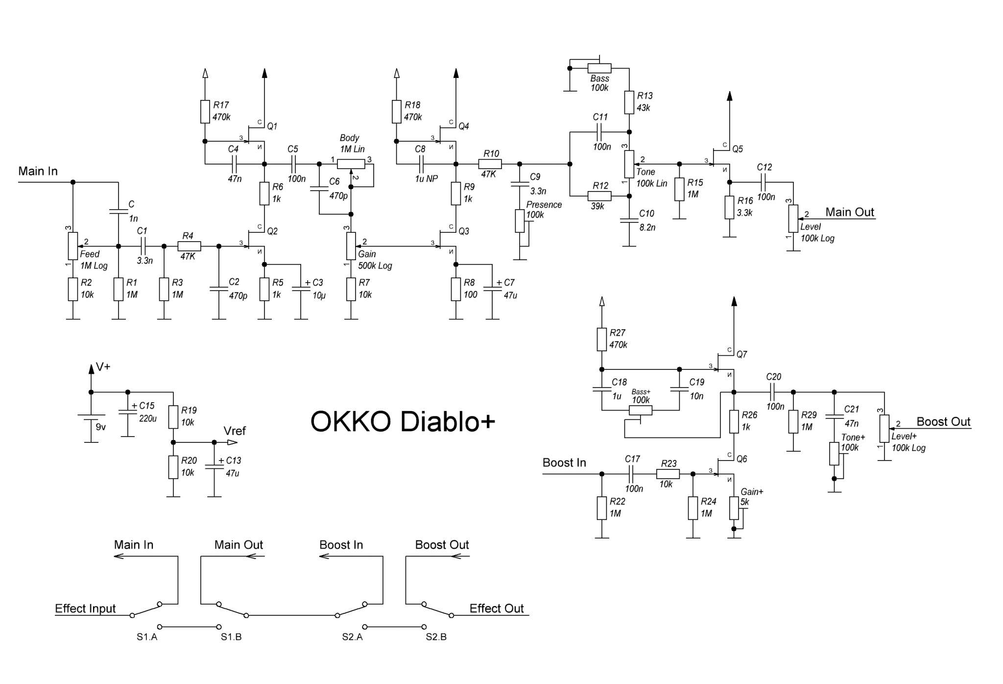 Из подобных примочек на полевиках, более-менее нормально звучащих, мне больше всего понравилась ОККО- Diablo на Мю-каскадах , самый толковый овердрайв на транзисторах, который я слушал. Лучше бы автор её собрал, схема не сложнее это точно , а звуком не будет огорчён это 100 %. Только там есть 2 варианта схемы- с удвоителем напряжения до 18 В и без него, то есть с питанием 9 В. Я пробовал её питать и от 9 В и от 18 В. Особо кардинальной разницы в звуке не заметил, хотя это как кому нравится. Полевики туда нада J201 . Прикрепляю схему. по которой делал, и проверенную печатку, по которой паял.