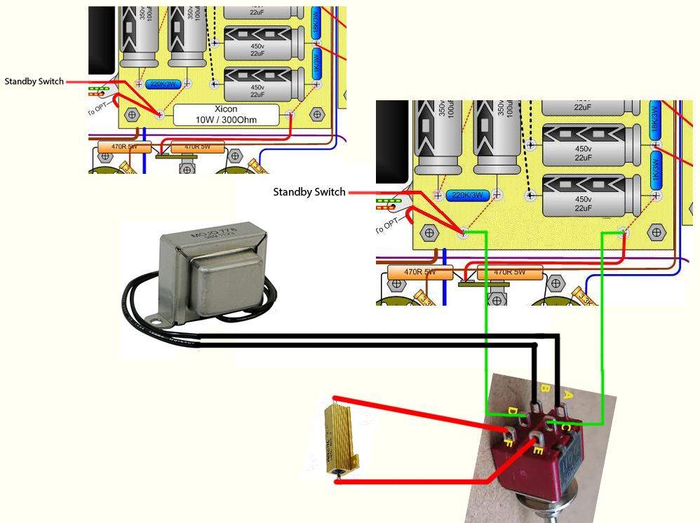 На картинке предполагаемое место установки переключателя отмечено прямоугольником, а двумя кругами, место куда должен будет придти провод от него. Вопрос, могу ли я проложить его сверху выходных ламп или необходимо обойти их справа/слева?