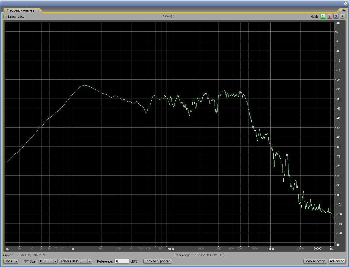 Файл "АЧХ по БШ" - ну, из названия файла ясно измерение. Кстати, специально не усреднял, использовал функцию "Scan selection" в Adobe Audition с окном Кайзера (180 dB) размером около 8192 отсчётов, в котором и происходит усреднение.