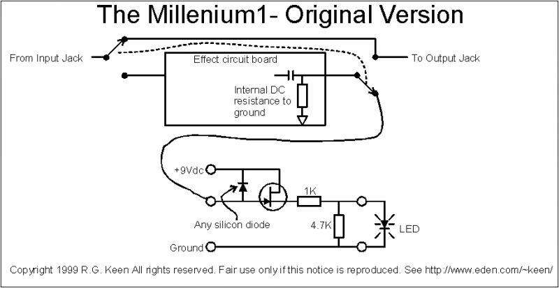 Можно сделать и на биполярном при условии, что сопротивление базового резистора гораздо выше выходного сопротивления примочки (по постоянному току). Т.е. базовый резистор должен быть 1МОм и выше. При этом также нужно использовать транзистор с большим Beta - 2N3904 тут вряд ли подойдёт. Резистор, включённый последовательно со светодиодом, тоже желательно сделать побольше, а сам светодиод выбрать из ярких.
