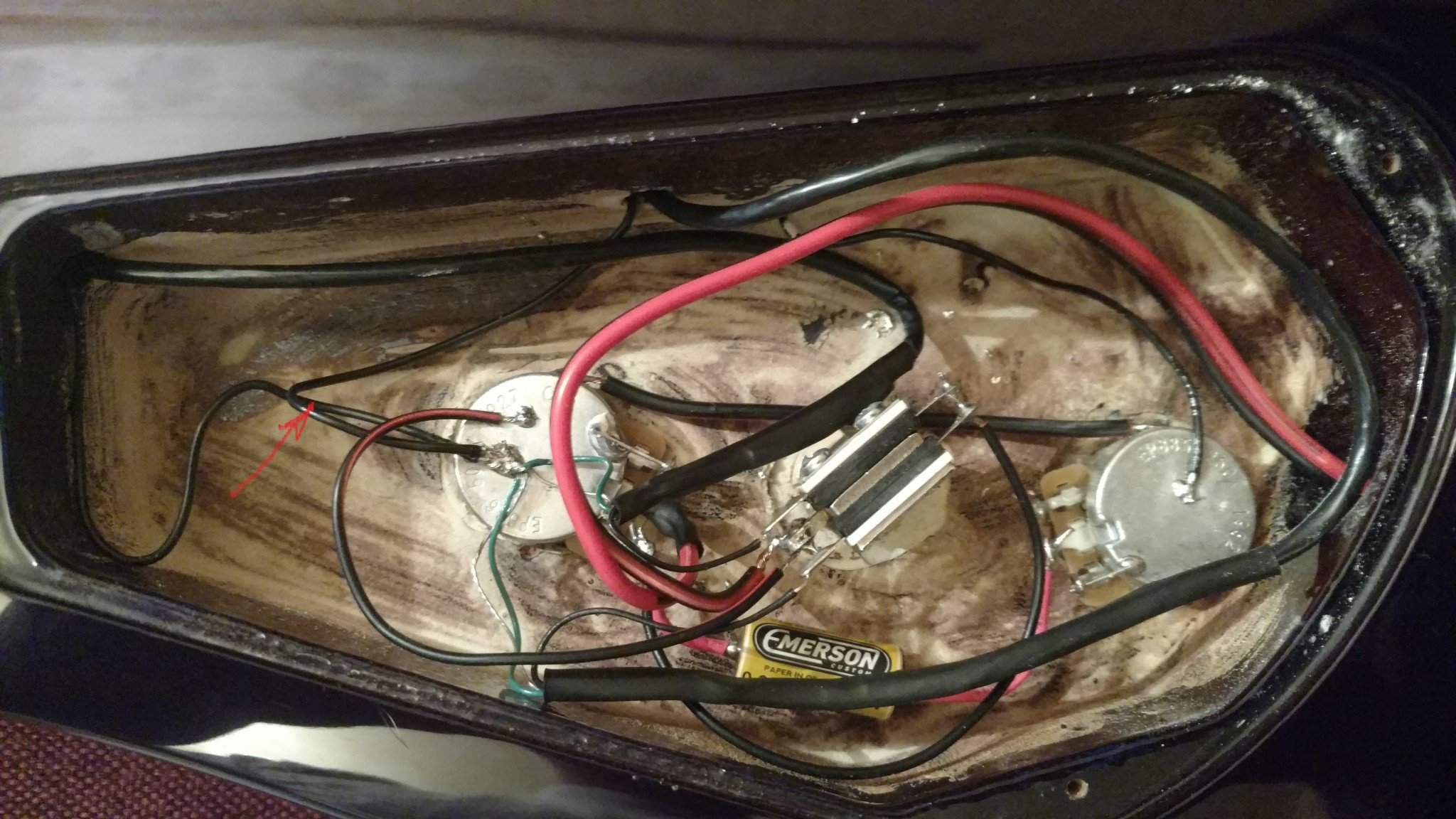 Далее я попробовал соединить оплетку и с потенциометром тона. И это так же снизило шум. В результате уровень шума стал таким же как и был на родном темброблоке. Вот собственно результат (красным обведены места пайки на шнуре разъема):
