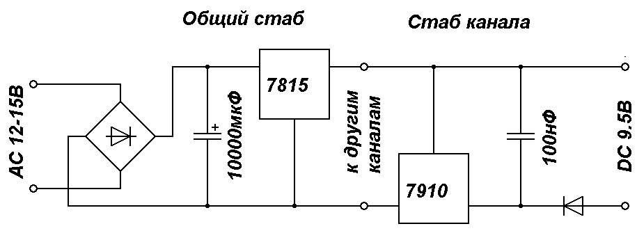 Типа 7910е стабы разделяют выхода минусов, теоретически должны блокировать проникновение переменной наводки из канала в канал, диоды на локальных минусах предохраняют выхода 7910ых от взаимного влияния друг на друга. 7910 взяты для компенсации падения напряжения на диодах. И надоть еще на выход 7910 и плюс резюк повесить кил на 20.