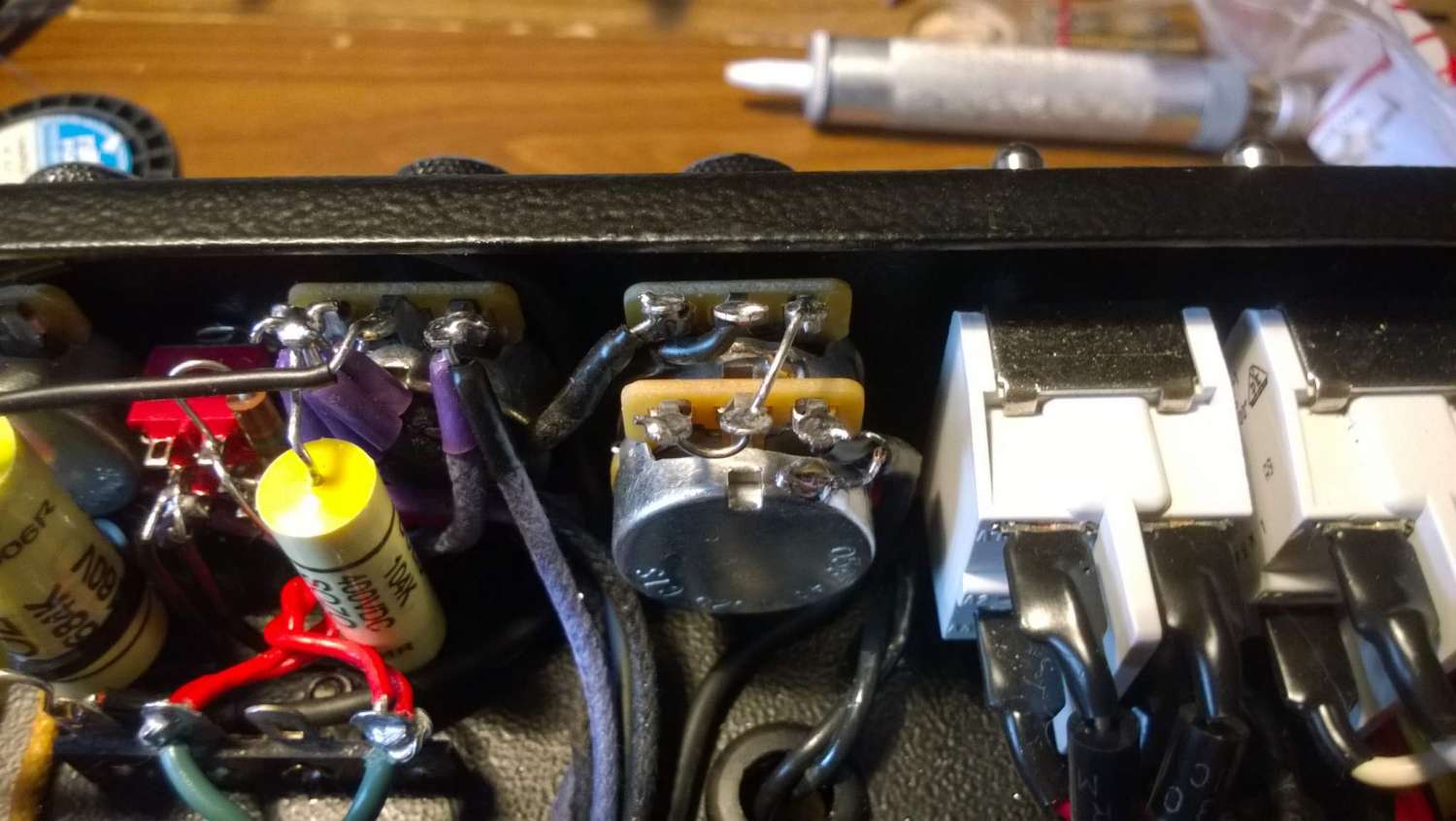 В моем случае это однозначно был конденсатор. После долгих ковыряний я психанул и все провода после преампа развел экранированным проводом - не помогло. А вот г-образный экран по размерам конденсатора помог. Но внешний вид его мне не понравился, и я в итоге развел весь фазик навесом на ламповой панельке, теперь все тихо. Допускаю, что это особенность MKT1813, я их там парочку попробовал. И, как я уже говорил, слышно было только на ночной громкости - у половины серийных усилителей такая же фигня.