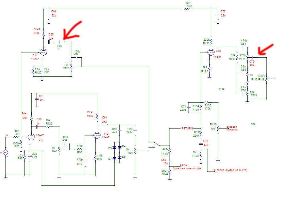 Попал в руки этот комбик. Из маршалловского вырывающего мозг сервис-мануала перерисовал схему преда в понятном глазу обличии. Конечно батхерта от увиденного не удалось избежать - разбазаривание триодов попусту, диоды в ООС, проходные пикушки в клине и на выходе. А между тем конкретно 312-й вроде как считается удачным и надежным...трансы дрейк, мейд ин энгланд, удачный дин, аура винтажности и бренда, дающая +500 к вдохновению. Откровенно порадовали реализованные через отводы буферы сенда и оперов ревера, по идее не жрущие звук. И трушный ретурн. Стоит ли ковырять пред данного девайса в сторону улучшения ?