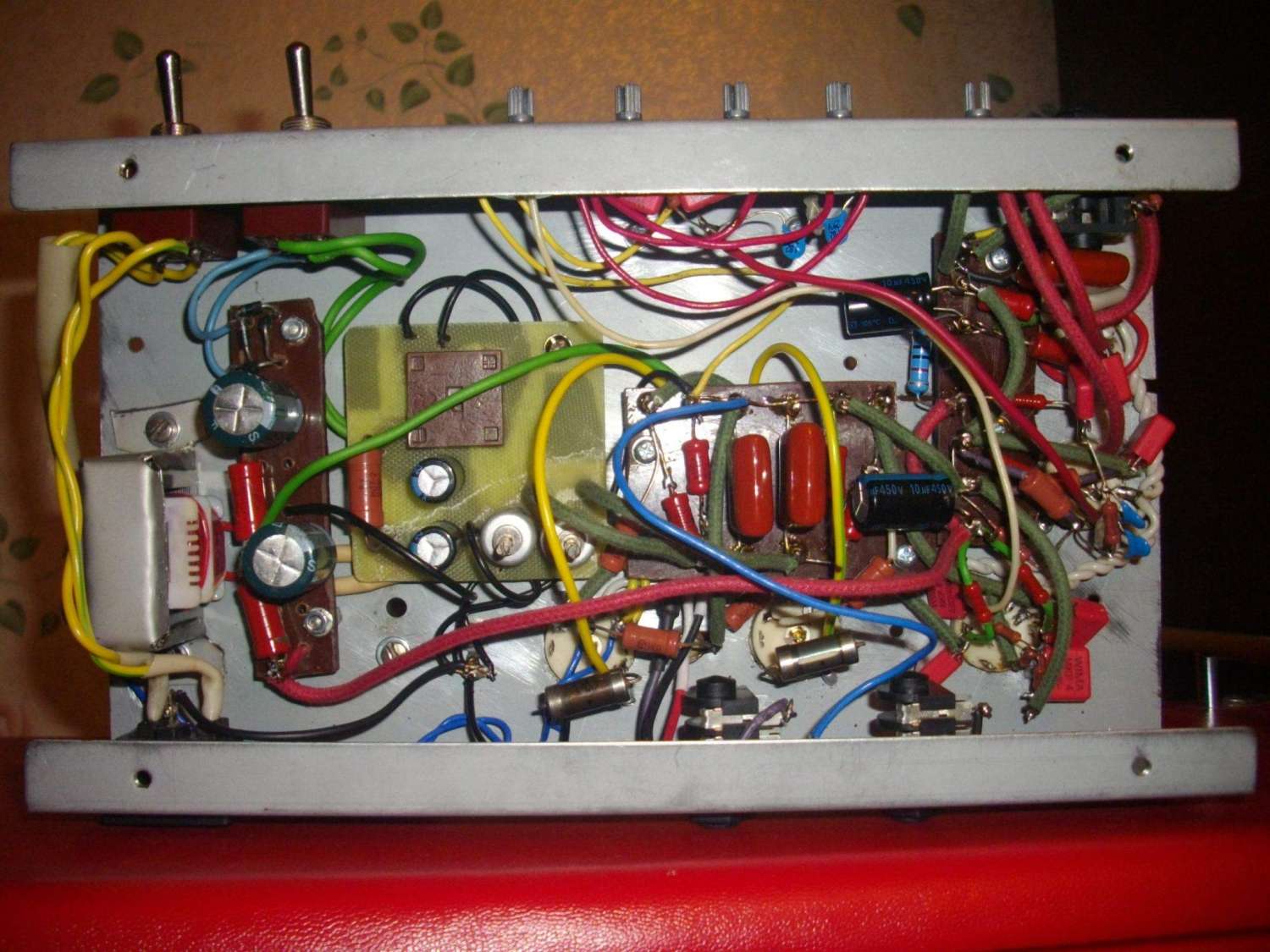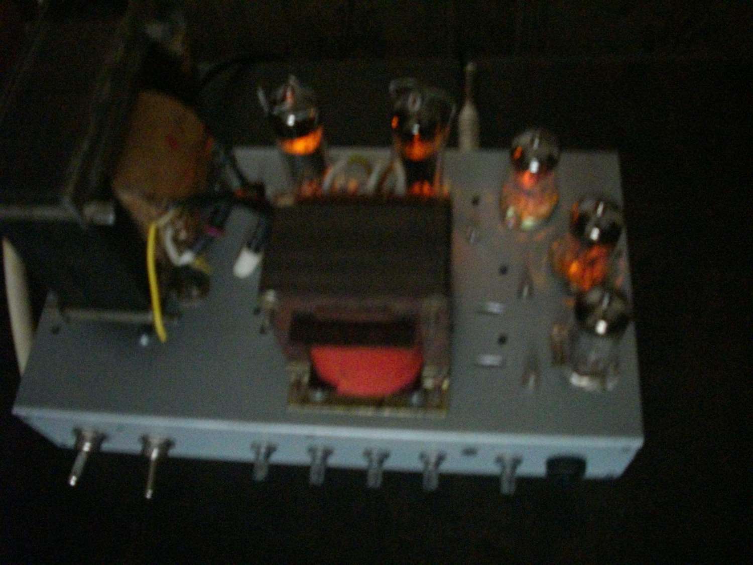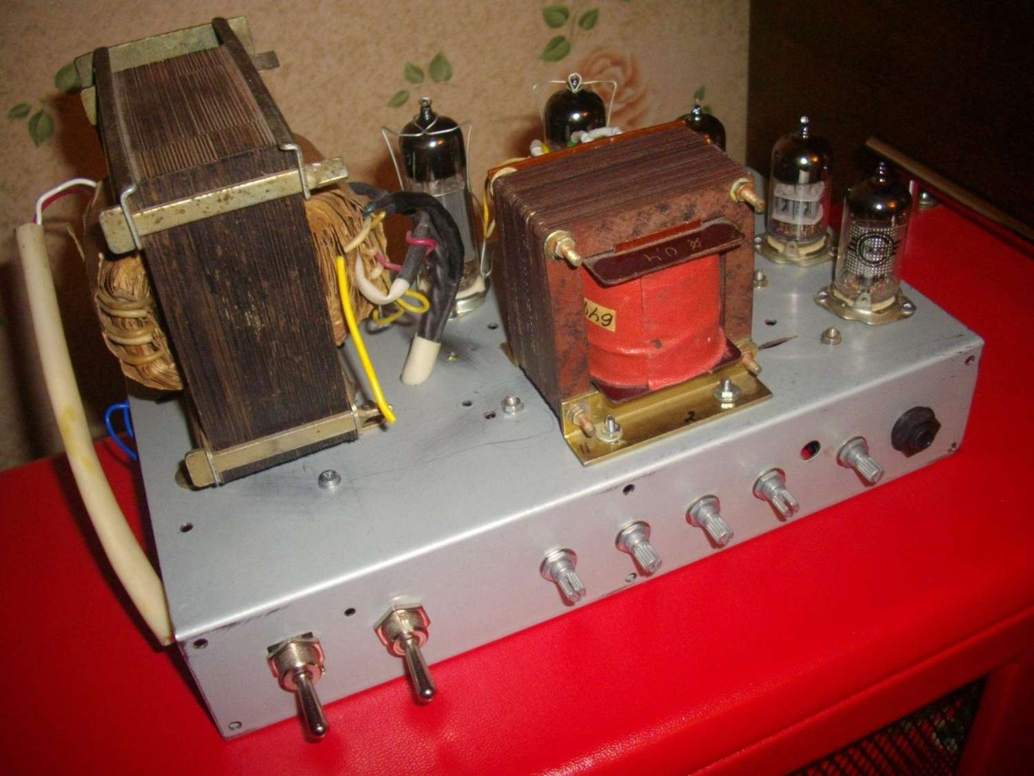 ). Мощник на паре 6п43п-е, фиксированное смещение. Фазоинвертор тоже 6н2п. Всё располагается на маленьком шасси. Когда-то оно было в китайском 10 ваттном комбике, потом там был кранк с однотактом, а сейчас вот.