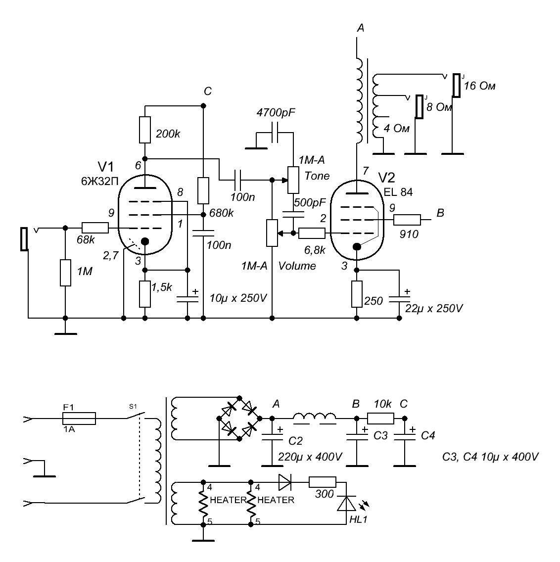 И еще между второй сеткой 6ж32п и резистором 680К + 100 нФ поставь резистор на 1К-1,5К - немного усиление уменьшится, но и звук мягче станет.