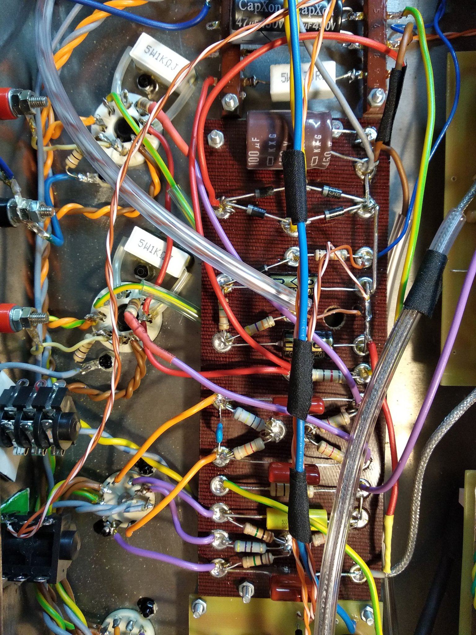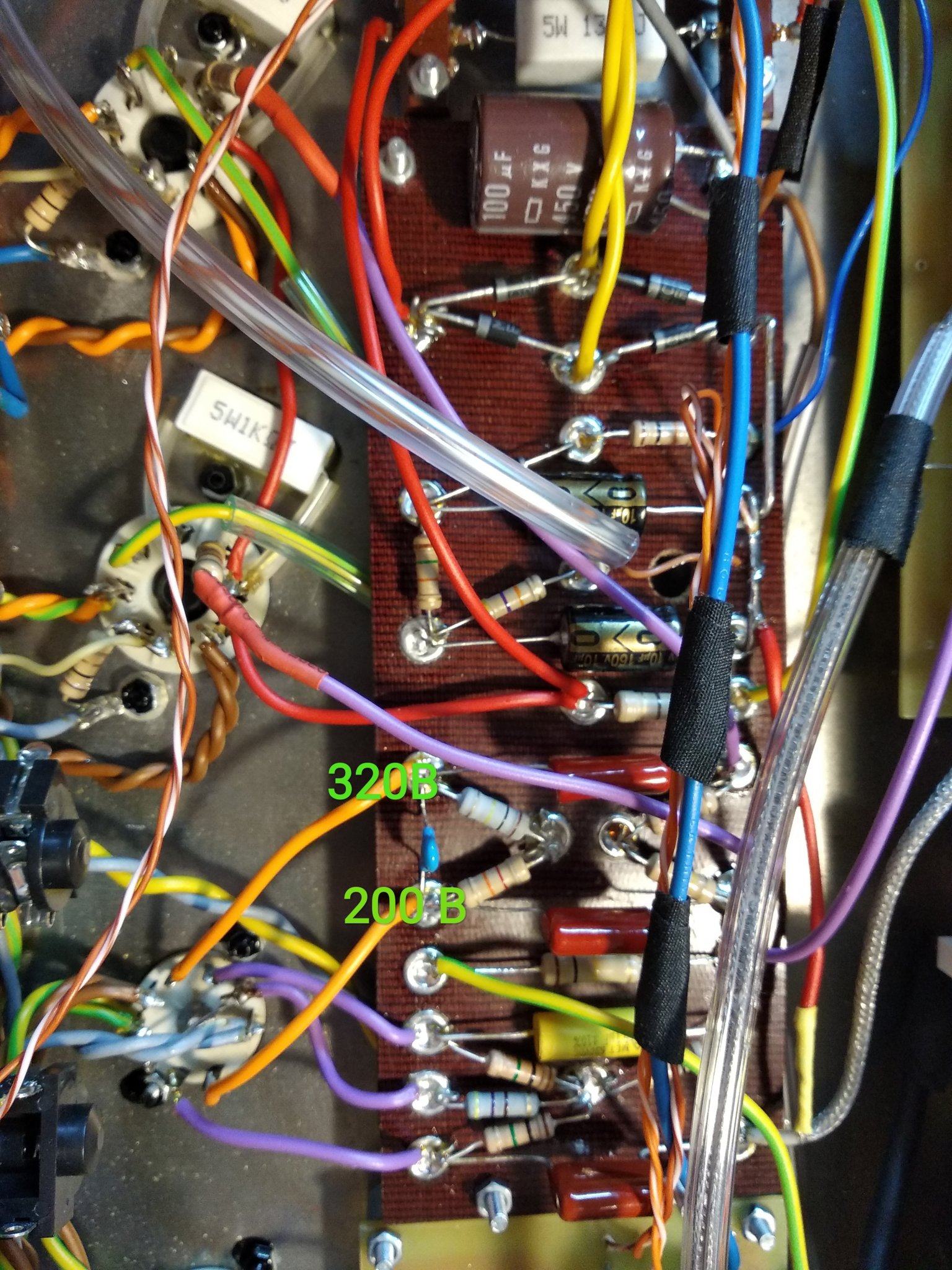 ( 2 выв . 19 В, 7 выв. 21 В ) ,катоды 3+8 выв. 30 В , андоды ( 1 выв . 207 в , 6 выв. 320 в.) При вытянутых выходных лампах напряжения на фазике такие же , при вытянутой лампе фазика анодное одинаковое по 350 в. Ну и самое интересное что мощник в целом уже нормально работает , не гудит при выкрученном мастере в ноль.