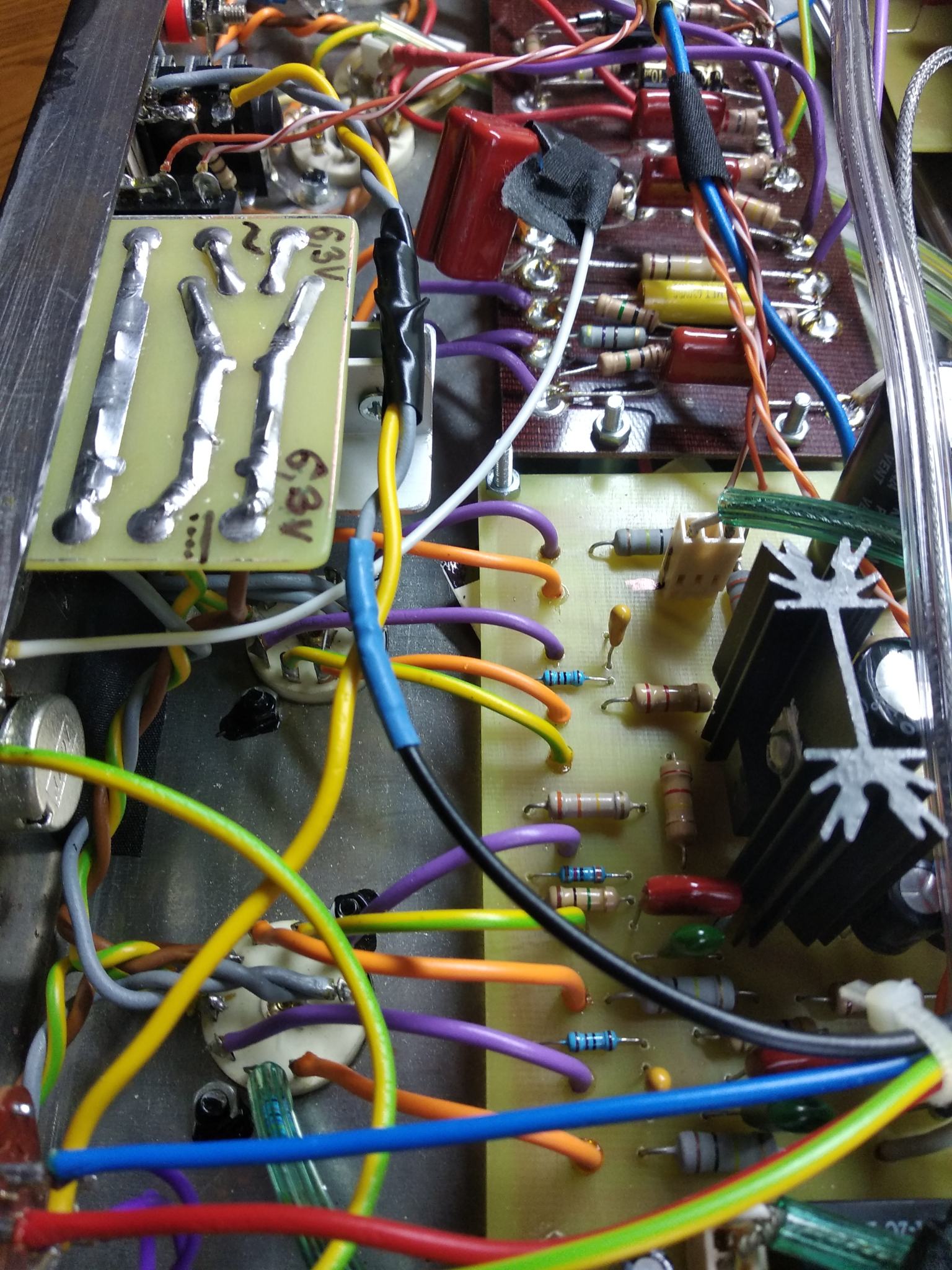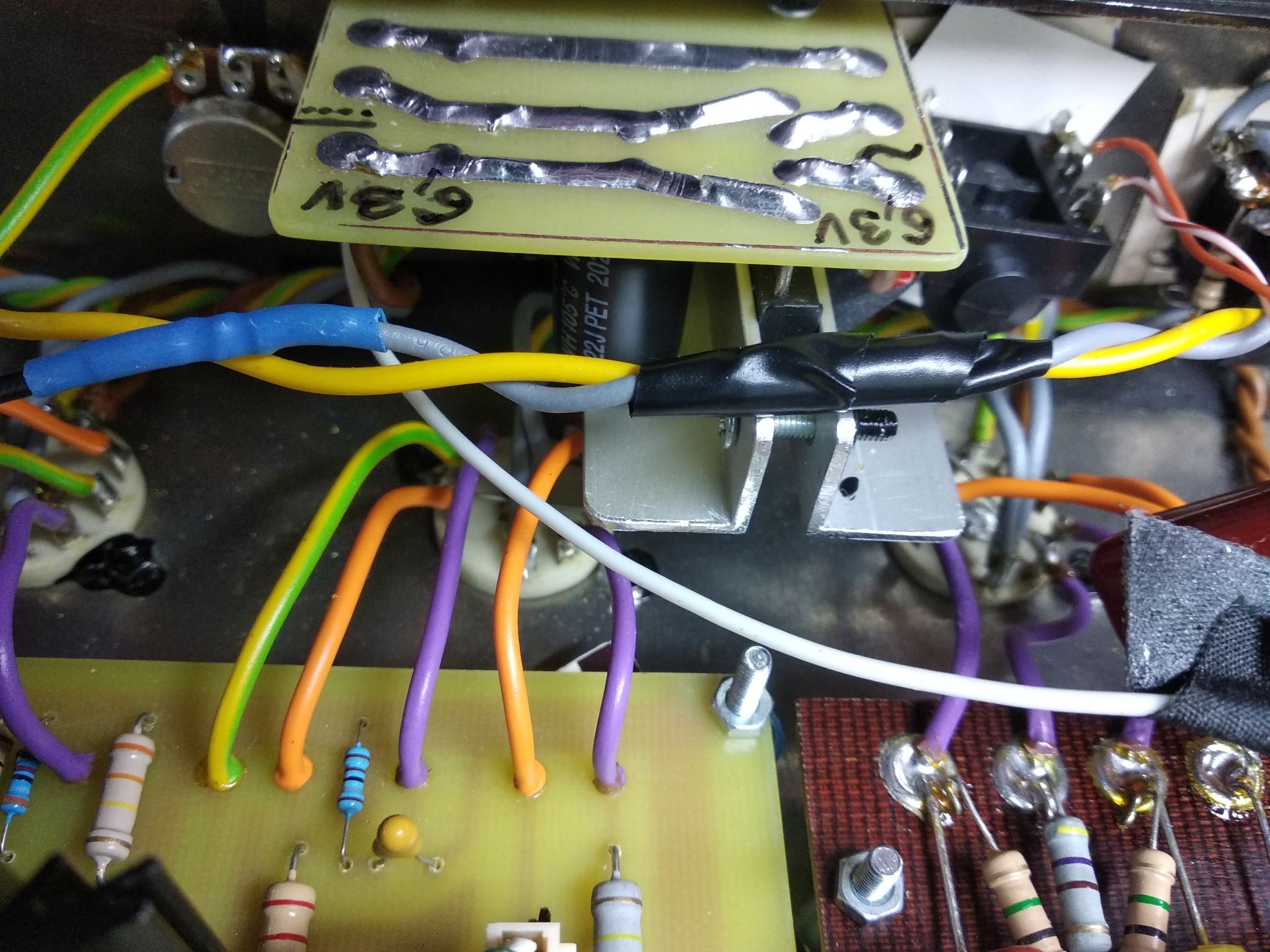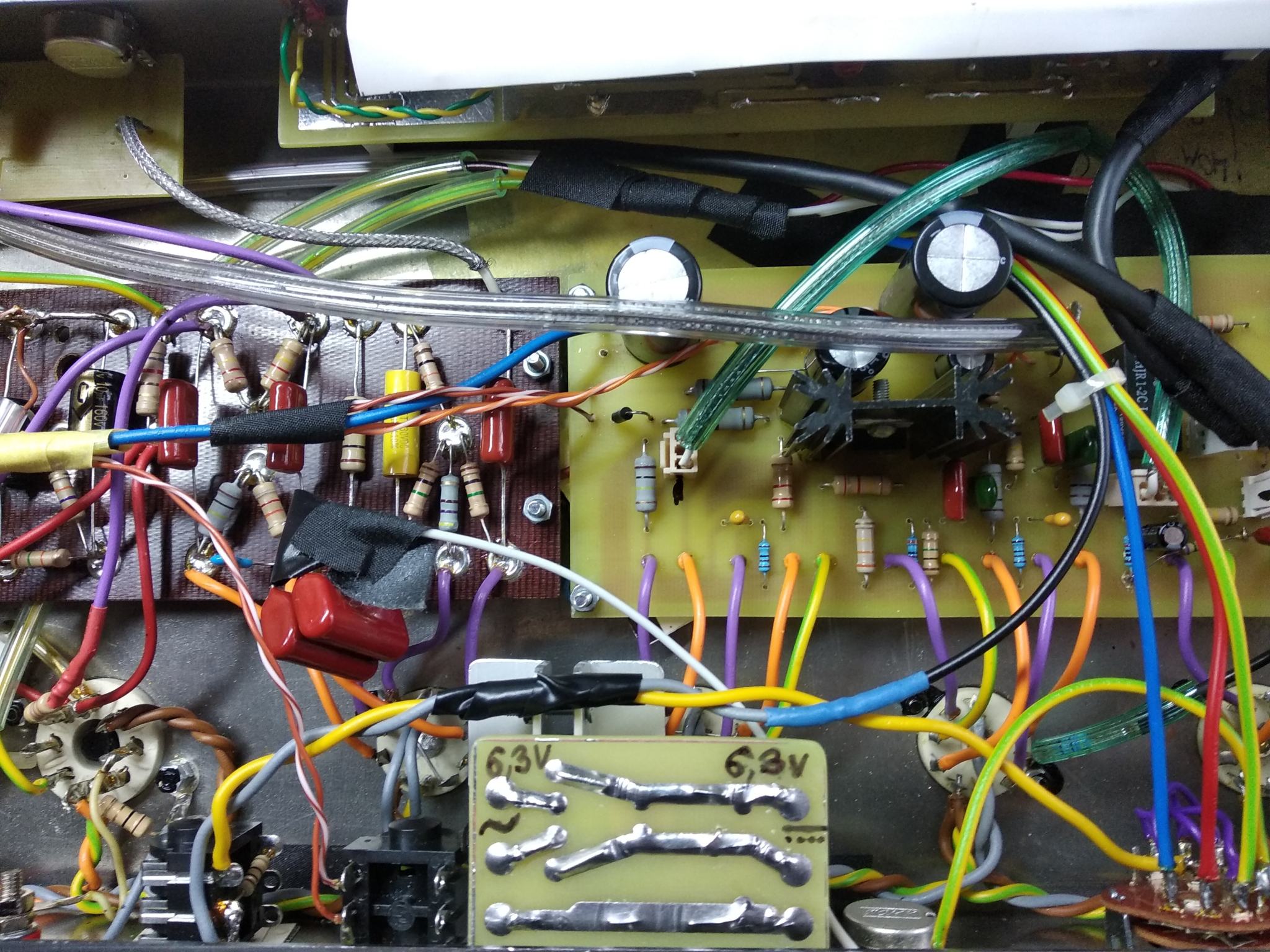 Вобщем перепаял землю в фазике на плате презенса как положено по совету alkuz , коротким проводом от резистора сразу на шину земляную , и отрезал землю по экрану со стороны входа в мощник с одной стороны. Теперь по фен шую, петель земляных в оконечнике нет. Потом поменял 100 нФ в цепи оос на 5 мкФ , и ещё добавил регулятор переменник Depth на 100 кОм в ООС . Стало намного лучше, звук вернулся как был раньше, мощный и сочный без зудосрача . Напряжения все те же, на анодах фазика 230 и 220 В. Токи покоя одинаковые по 35 мА.